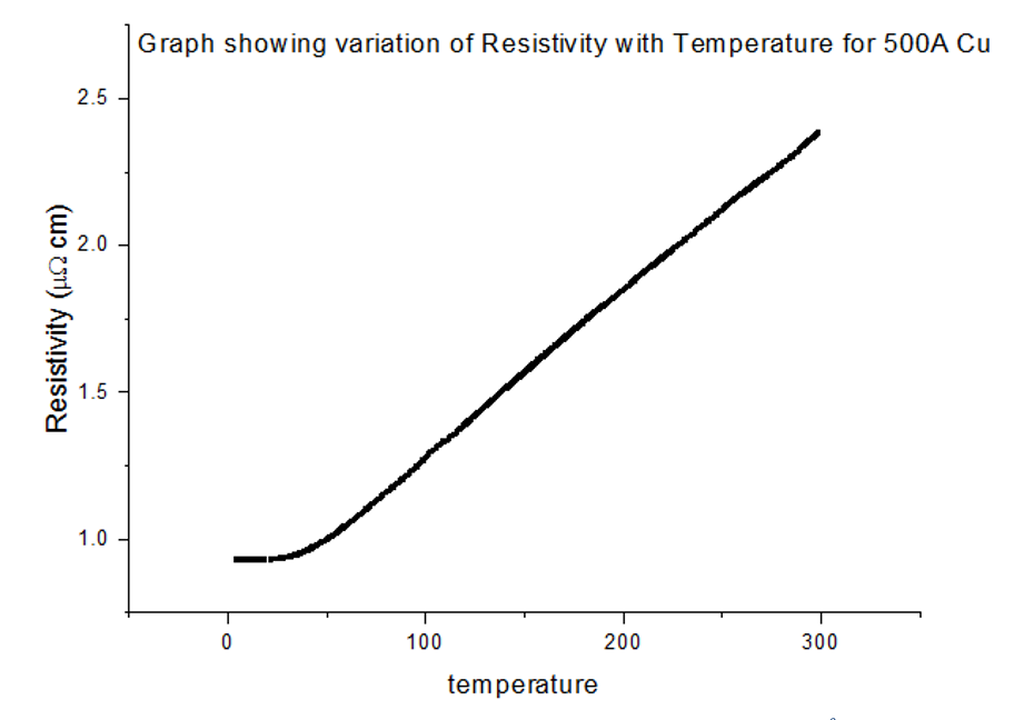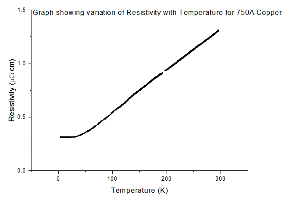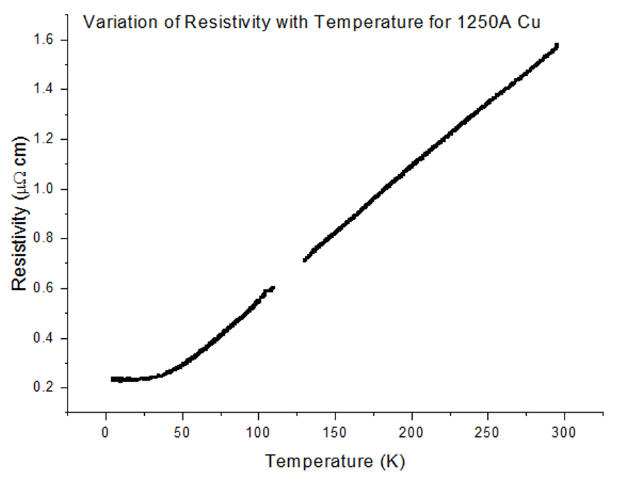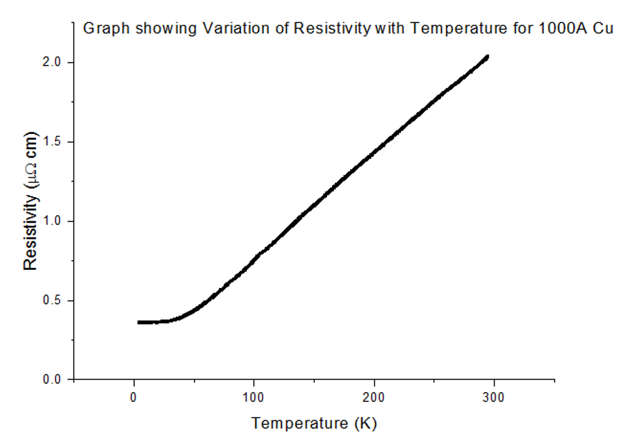 All ρ-T graphs for Copper, of all thicknesses, followed the same trend as the Bloch Gruneisen function. As the temperature fell from 300K, the resistivity dropped linearly, where ρ∝T; then, at a certain temperature, the trend became similar to ρ∝T5. A few more Kelvin colder and there was no more temperature dependence, ρ∝T0, on the resistivity, as temperature dropped down to 4.2K