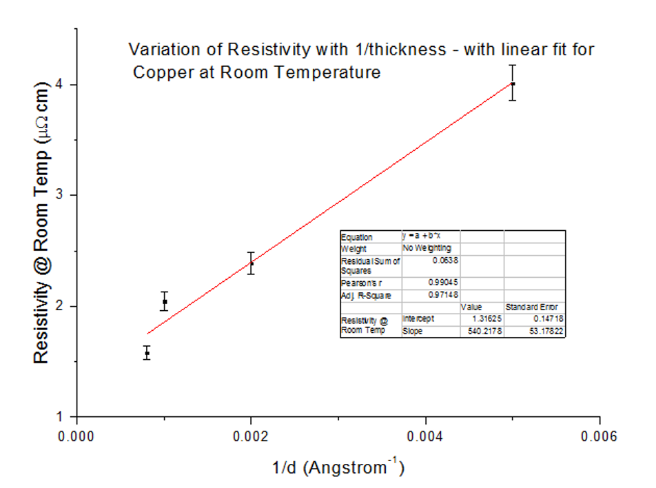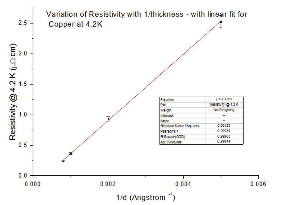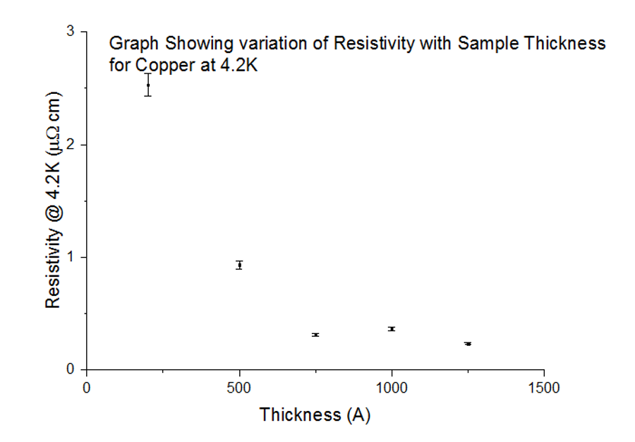 The calculated values for the low temperature 4.2K graph were much further from the book values. Firstly, the calculated bulk resistivity of Copper at this temperature was negative, which is not possible. Secondly, as temperatures become so low, the mean free path of Copper is considerably higher due to reduced electron-phonon interaction rates of around 0.3cm; the calculated value is multiple orders of magnitude lower than this. Such correlations at 4.2K can be due to the mean free path being much higher than the thickness of the sample; as a result, the Fuchs Sondheimer model breaks down due to surface scattering taking over. This allows us to draw two conclusions: