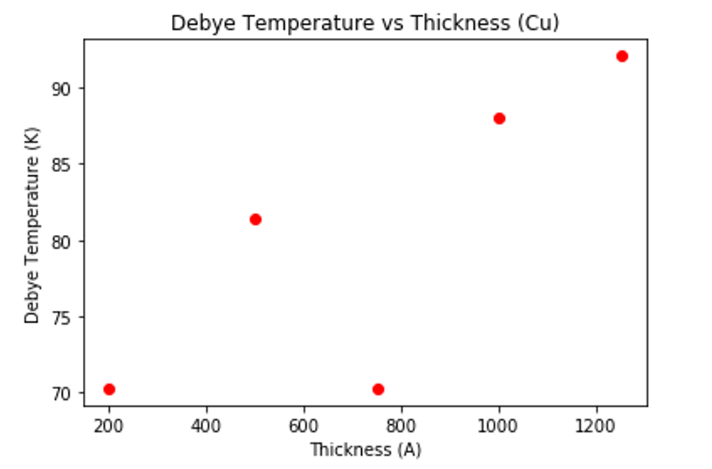 As the film thickness increases, the Debye temperature also increases. This is due to phonon softening, which is due to missing bonds at the film interface, leading to different vibrational amplitudes [5]. An anomaly was observed at Copper of thickness 750Å; it was determined to be due to the accidental use of a misplaced 200Å thickness sample amongst the 750Å samples.