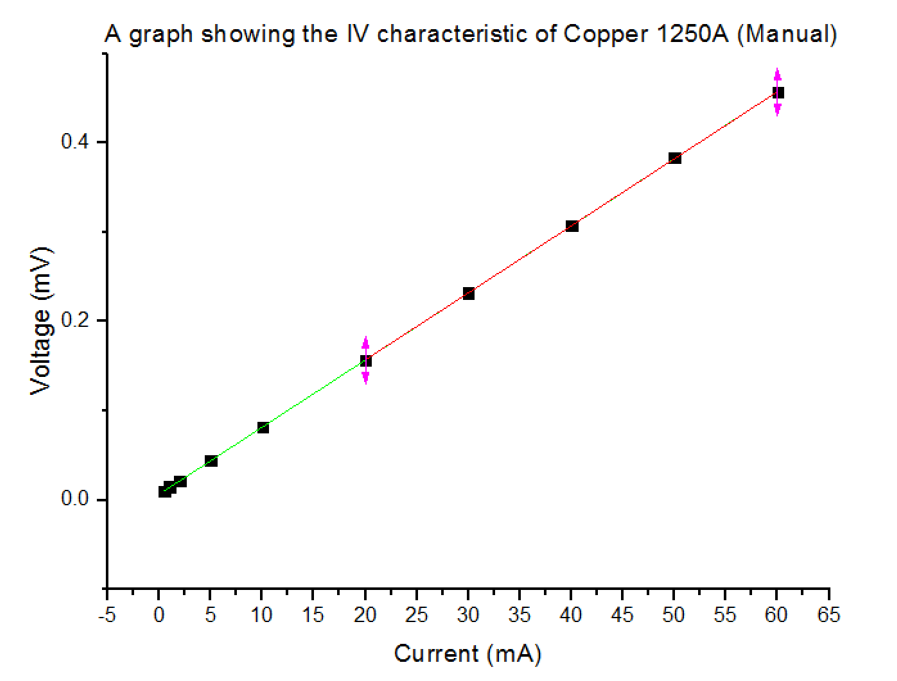The first sample, Copper of thickness 1250Å, was placed on the probe stick. The current was then manually altered and the corresponding voltages were recorded. Figure 10 shows that from 20mA to 60mA, I∝V, therefore, any current in that range is suitable to use for the experiment. 30mA was chosen. Having chosen this current, a reistance-temperature measurement was recorded using the software.