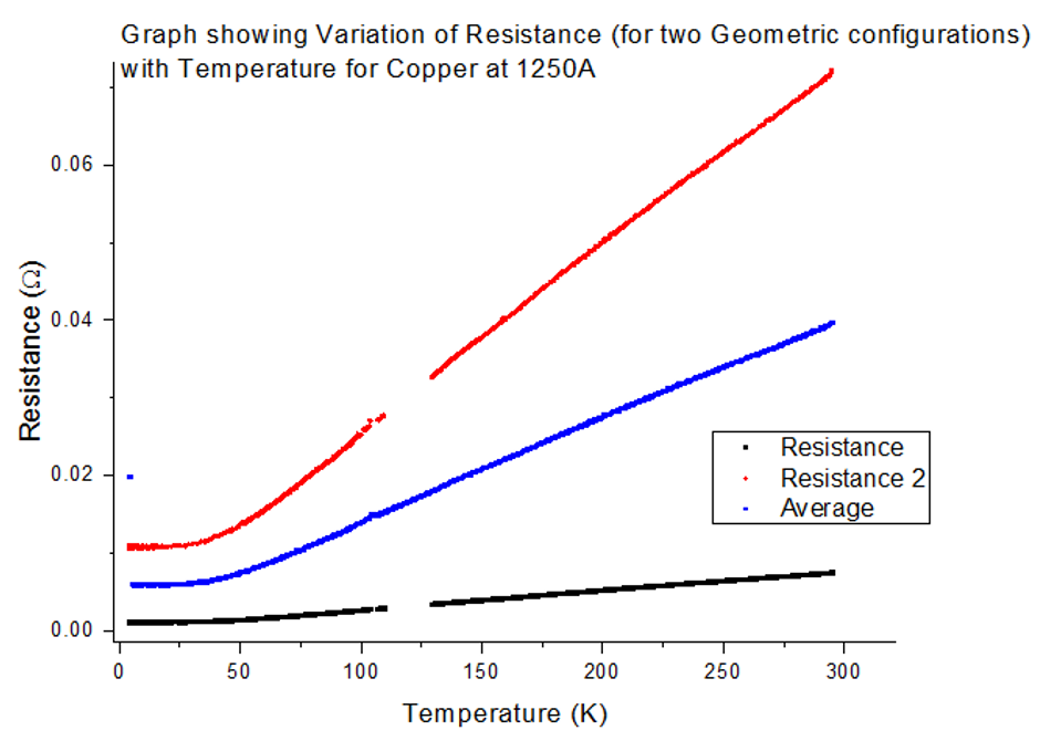 Since an IV characteristic was already obtained for Copper of this thickness, in section 4.1.1, this step was not repeated. As previously mentioned in section 3.5, two resistances were obtained, with their temperatures, from the rotation of pin configuration method. These resistances were: