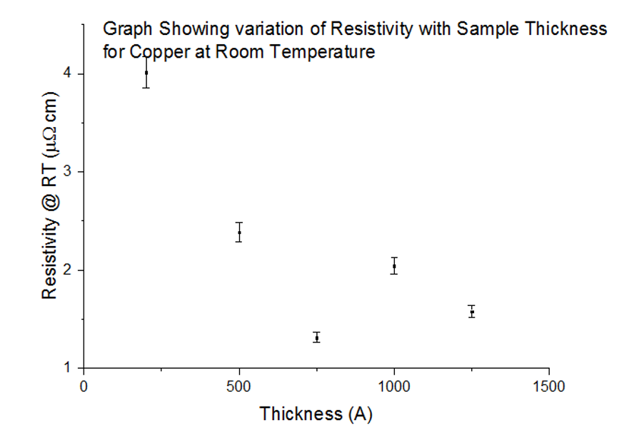 As a test run, the resistivity of Copper, of thickness 1250Å, was calculated, at room temperature, using the Van der Paouw Equation. The correction factor was assumed to be 1 due to there being only 1 resistance value. Using equation X, the resistivity value calculated was ρ=0.425±0.0006μΩcm. The accepted value of the resistivity of copper at that particular thickness, room temperature, is ρ=1.68μΩcm [1]. The experimental value appeared to be an order of magnitude less than the book value, presumably due to the assumption that the correction factor was equal to 1. As will be shown; the correction factor plays a big part in ‘correcting’ the resistivity. Another uncertainty which causes this value to be innacurate, is that the contact points of the pins and sample are in the middle, as opposed to around their sides. This is a limitation as resistivity changes with the size of a material; in this experiment’s case, it is best to have the contact points in a fixed position, as the sample size varies – i.e. not all the samples are the exact same size.