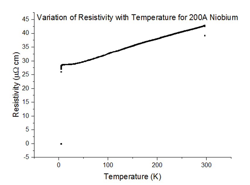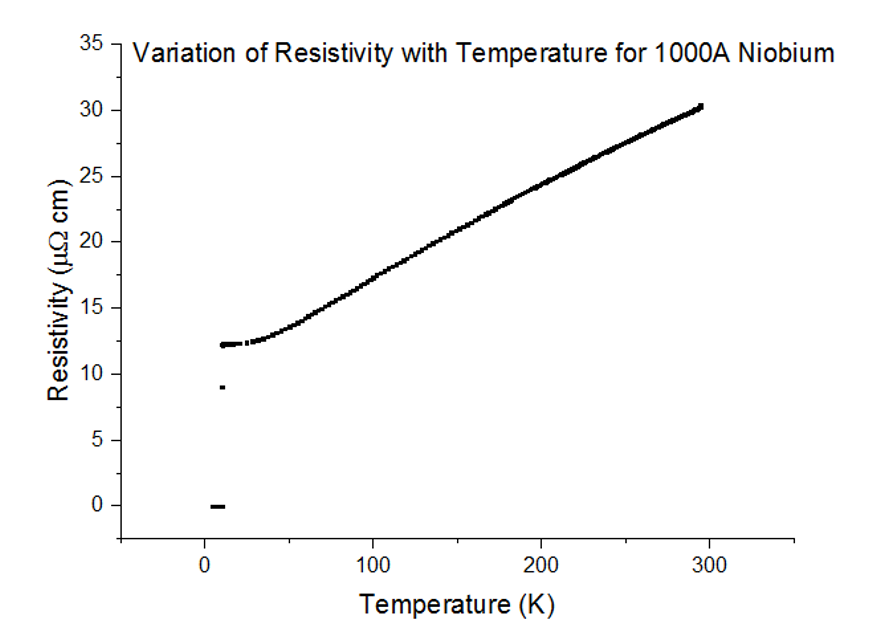 As can be seen, the resistivity instantly drops to 0 at a specific temperature. Since the resistivity drops to 0, the resistance must have also dropped to 0, which is the special effect of Superconductivity. The temperatures at which Niobium began to superconduct are: