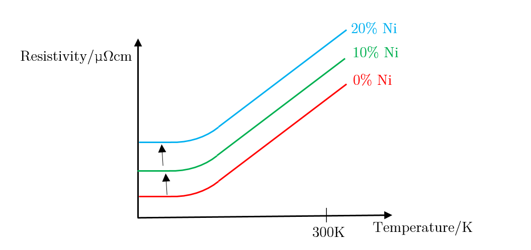 As can be seen, the large increase in resistivity for low Nickel contributions of under 20% can be explained by studying how the structure of Copper metal changes as more Nickel is added. As Nickel is progressively added to Copper, the Nickel acts as an impurity and disrupts the metallic structure of Copper; as a result, ρI increases, in turn affecting the residual resistivity, whereas ρL remains unchanged. This results in the slope looking the exact same, with it being translated up and down the y axis depending on the concentration of impurities in the metal. Figure 29, below, illustrates this well.