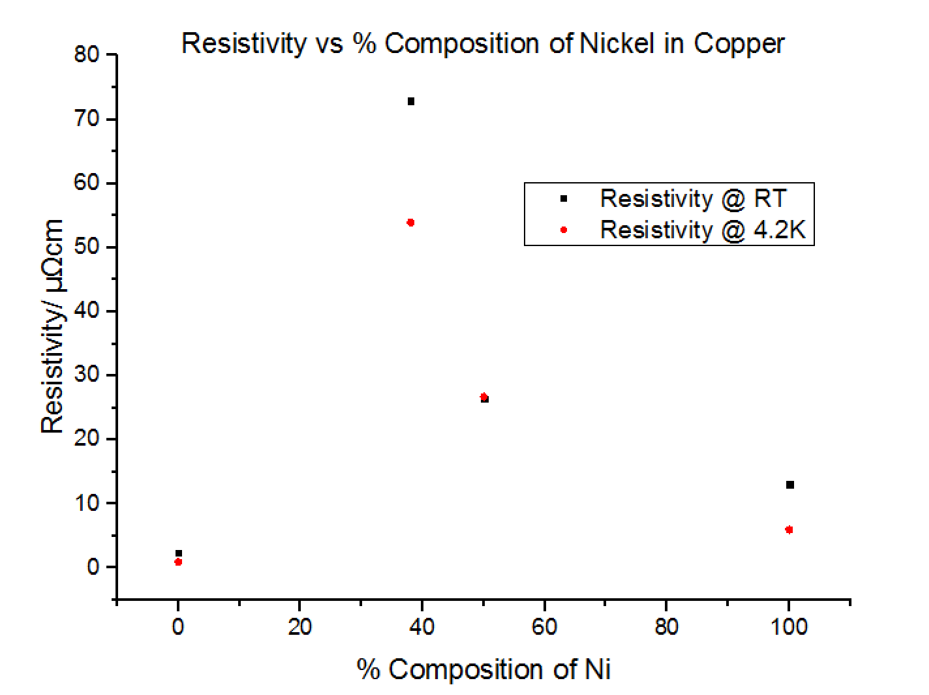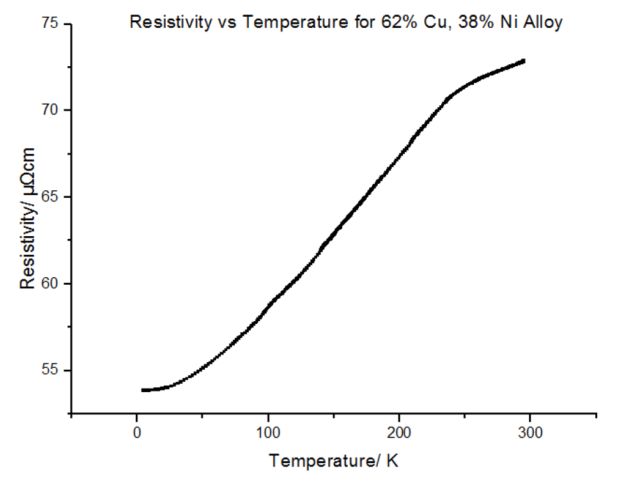 The above explains concentrations of impurities of up to 20%, but does not explain what occurs when this percentage is exceeded. Due to the different atomic sizes and valences of Nickel and Copper, scattering probabilities become higher and higher due to the change in the lattice parameter. Differences in electron densities, lead to different positions of Fermi energies, which in turn alters the population density and therefore the conductivity and resistivity [7]. Copper has one more valence electron than Nickel. Since Copper’s d-shell electron density is about ten times greater than that of its s-shell, the d-shells become full when 60% Copper is added to Nickel. This leads to the electron spins cancelling out, meaning there is no magnetisation. This explains the maximum resistivity at Copper 62% Nickel 38%. Deviating from this concentration decreases the resistivity.