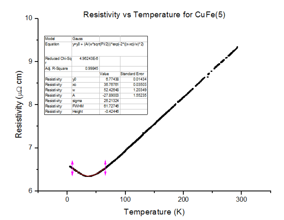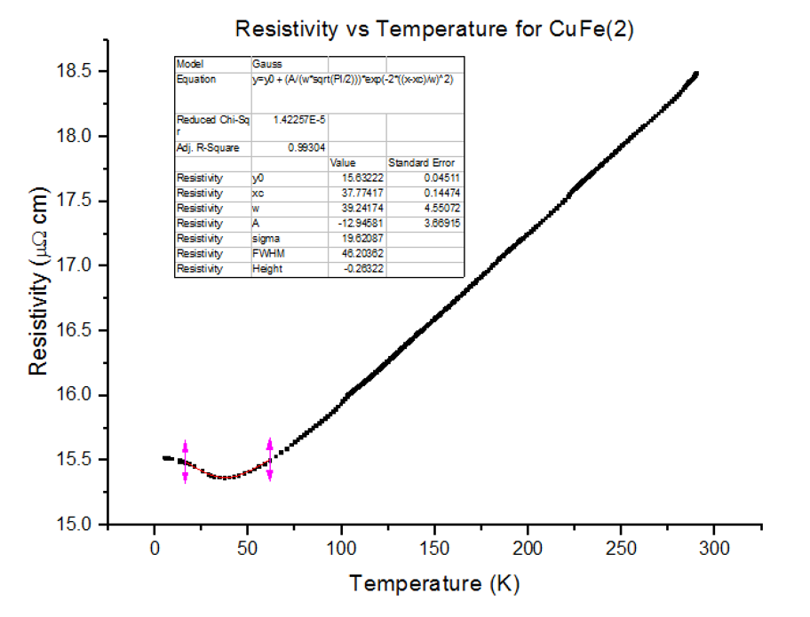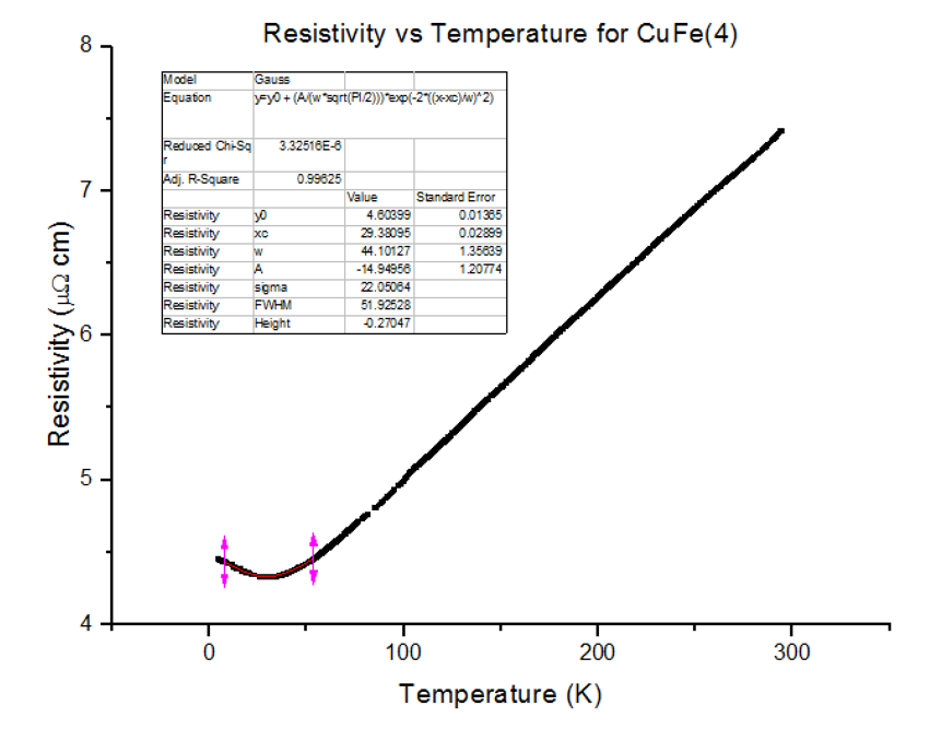 Three different Kondo samples, containing Copper and Iron, of unknown concentrations were dipped and their Resistivity vs Temperature graphs were extracted from the scans. A Gaussian was then fitted to the troughs of the data, to calculate the minimum, as shown below in figures 30, 31 and 32.
