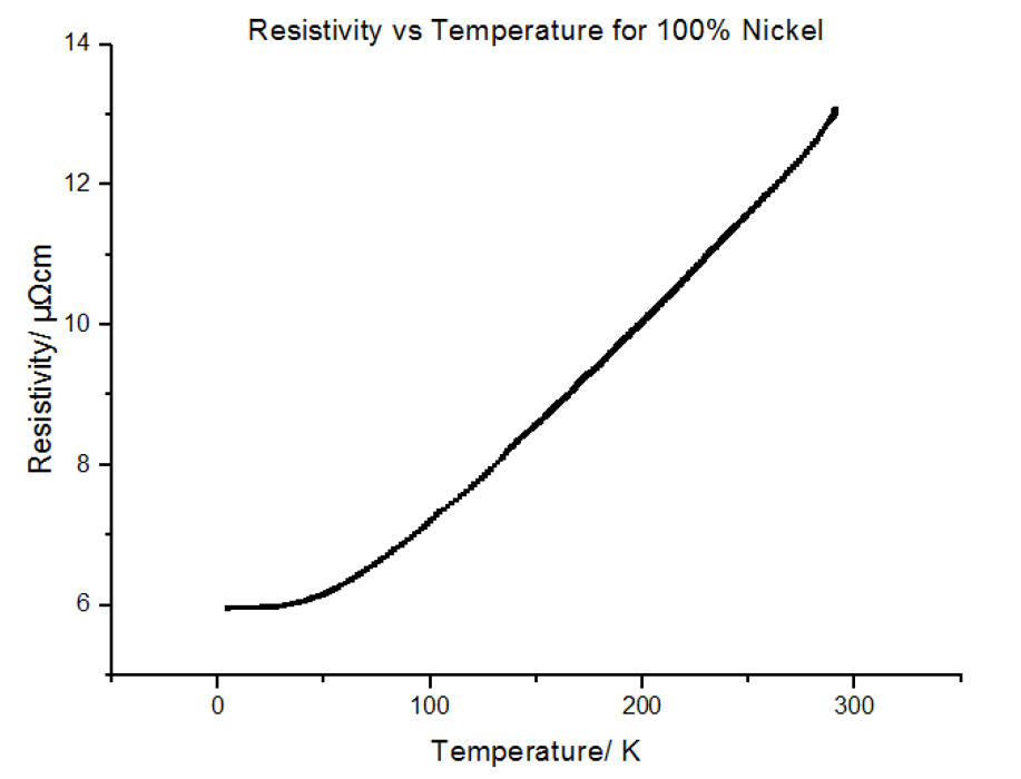 The Resistivity vs Temperature graph for 100% Nickel, is shown below, in figure 27.