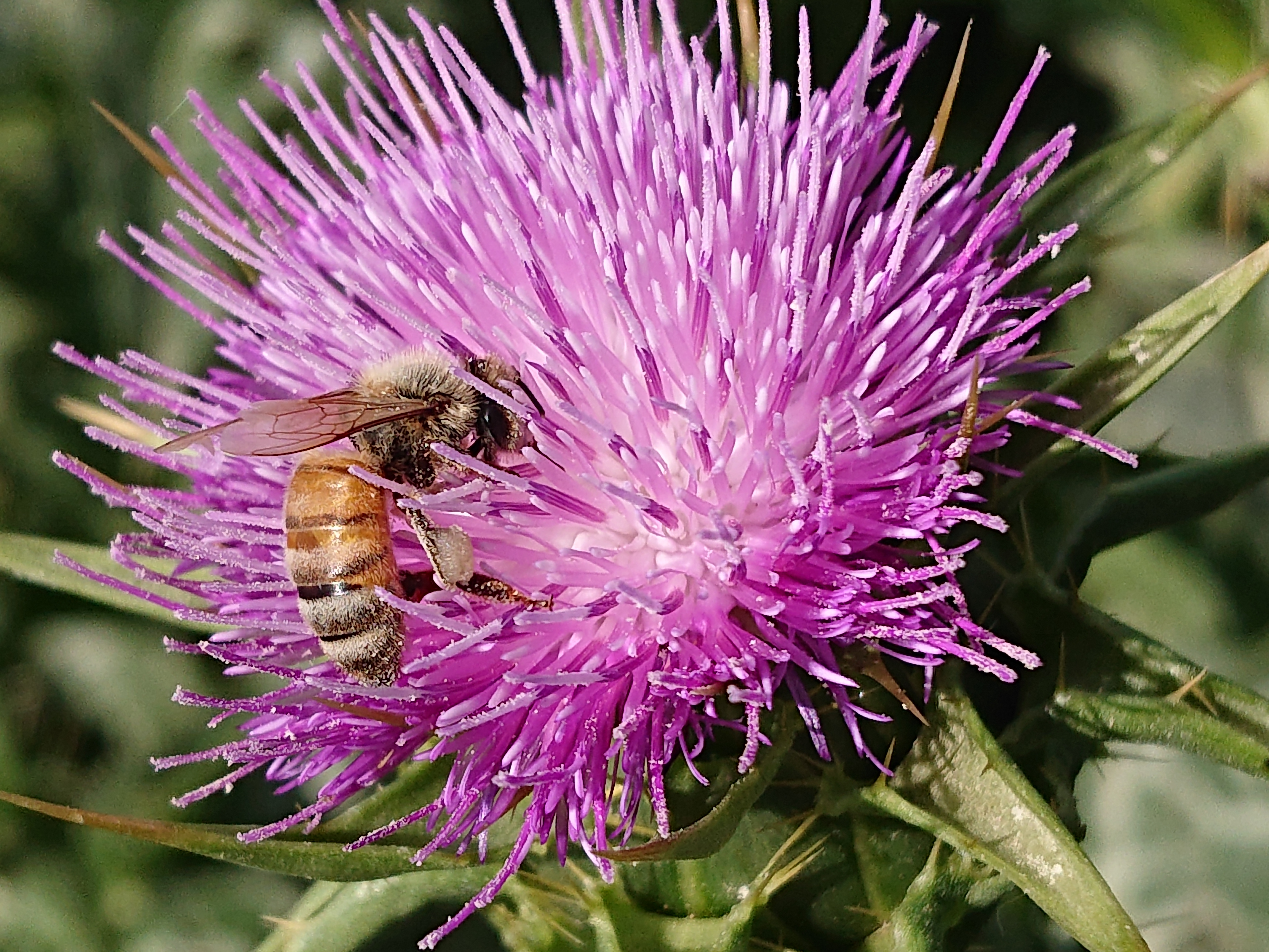 In this picturesque scene, we witness the beautiful dance between a bee and a flower as they engage in a vital ecological partnership. The bee, adorned with delicate wings and fuzzy body, hovers gracefully above a vibrant blossom, delicately extracting nectar from its enticing depths.