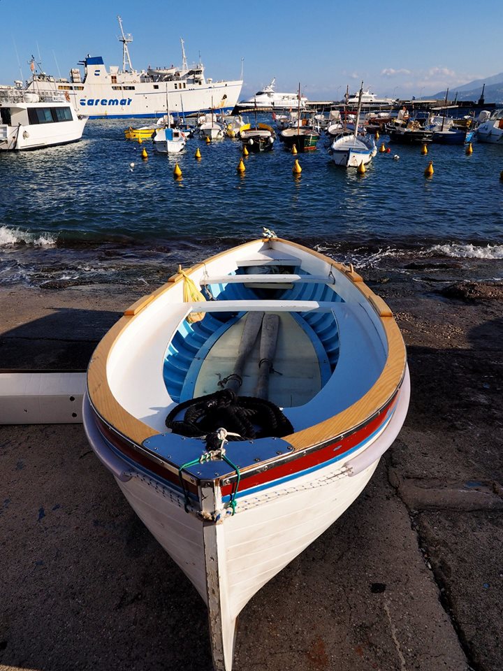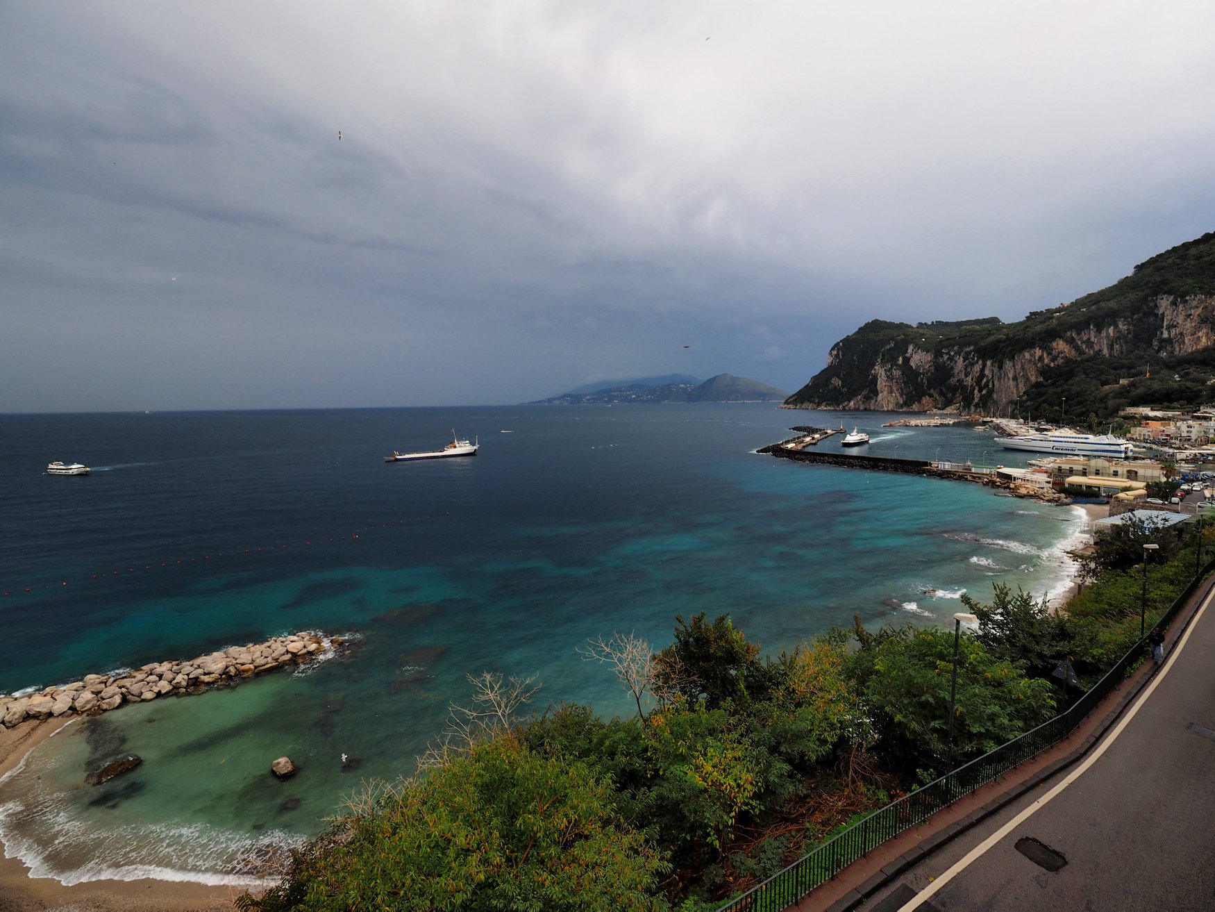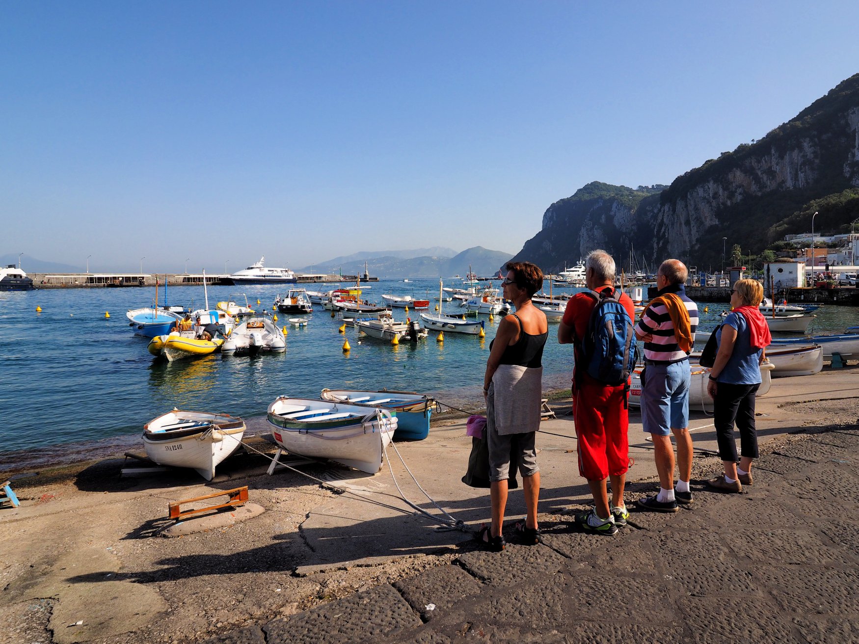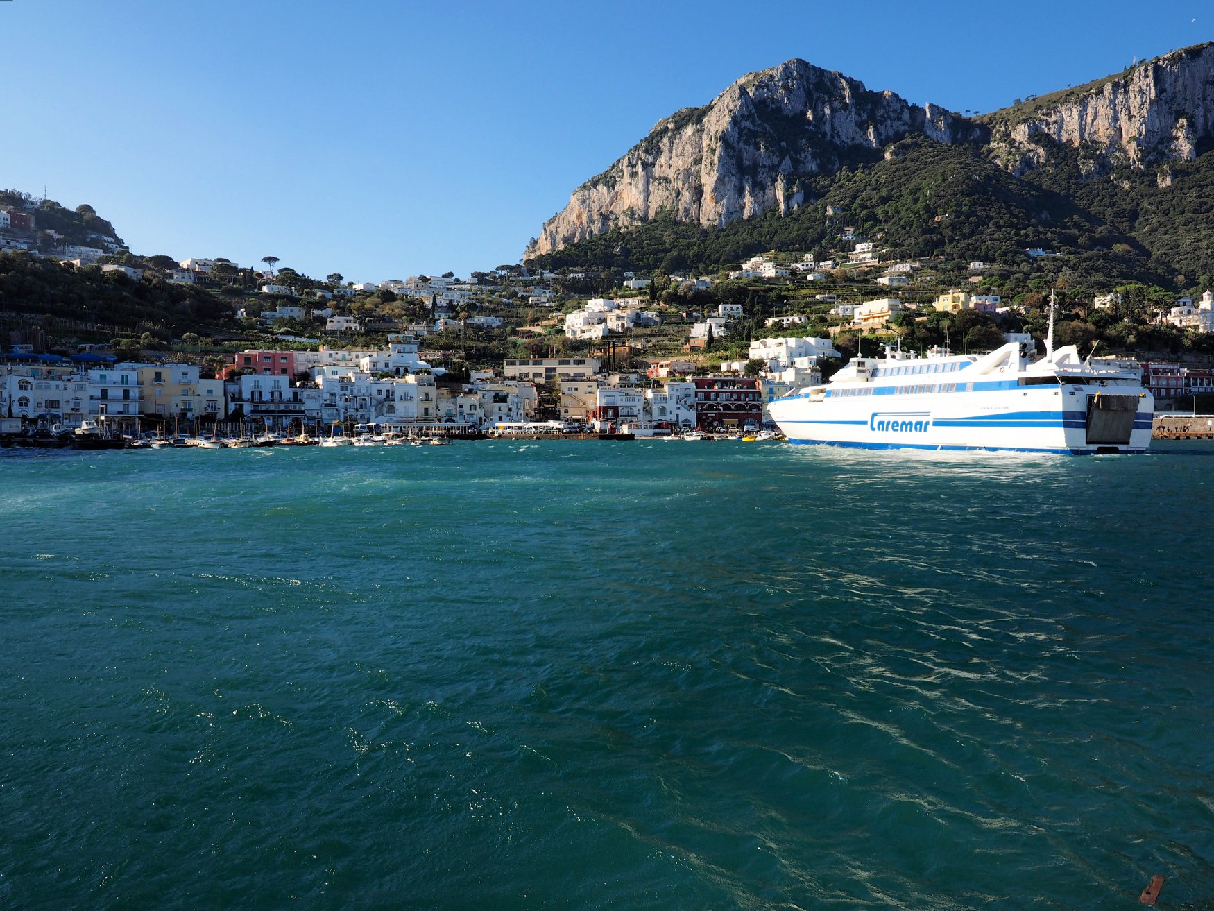 특히 재키는 카프리를 너무 좋아해 홀로 또는 디자이너 발렌티노 등과 함께 골목길을 거닐기도 했다. 이후부터 재키가 입던 흰색 바지와 검은 선그라스는 여행자들이 유행처럼 따라 하기도 했다. 나폴리(또는 소렌토)에서 출발한 페리가 정박하는 곳은 마리나 그란데 항구. 카프리 섬에서는 세상과 유일하게 연결되는 섬의 입구이자 관문이다. 항구는 여름이면 관광객들이 너무 많아 발디딜 틈 조차 없지만 봄, 가을에는 한산하여 여유있게 즐길 수 있다. 선착장에 정박해 있는 보트는 개인 소유도 있지만 대여해 주는 렌탈보트도 많다. 매표소 옆으로 자갈이 깔려있는 카프리 해변에는 몇 사람이 보일뿐 조용하다. 카프리 섬은 마리나 그란데, 카프리 그리고 서쪽의 아나카프리로 크게 나뉘어 진다.