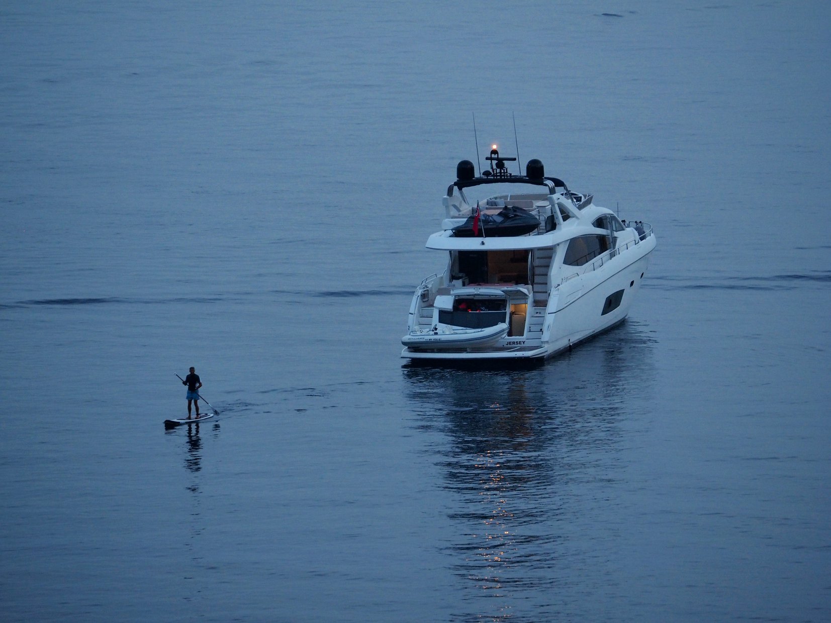 보드 위에 올라 노를 저으며 나아 가는 요트 주인 현대판 ‘물 위를 걷는 예수님’이다