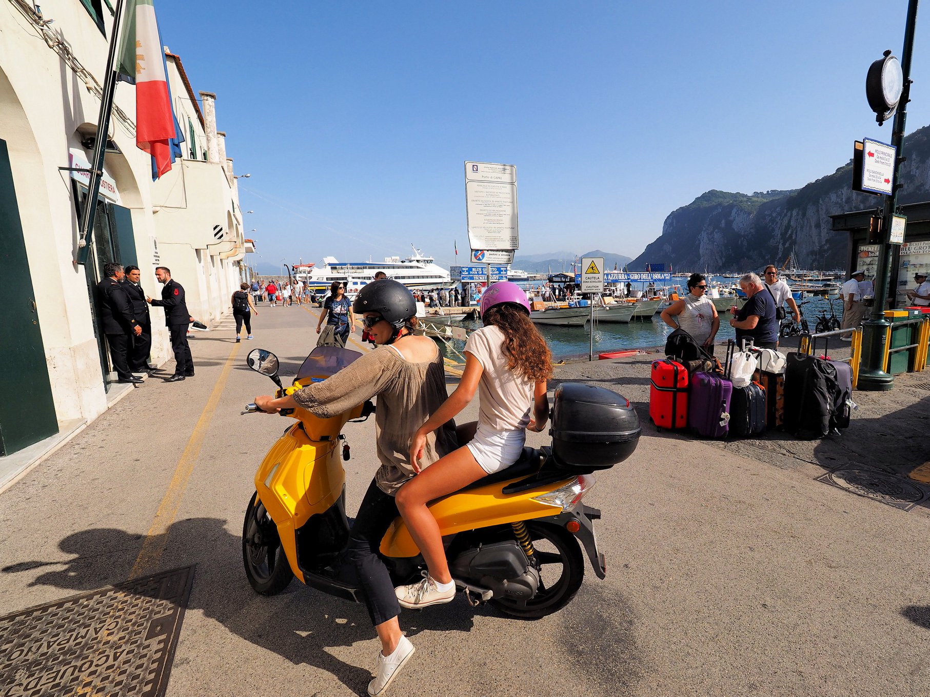 스쿠터를 타고 마리나 그란데 항구를 다니는 이탈리아 여인들