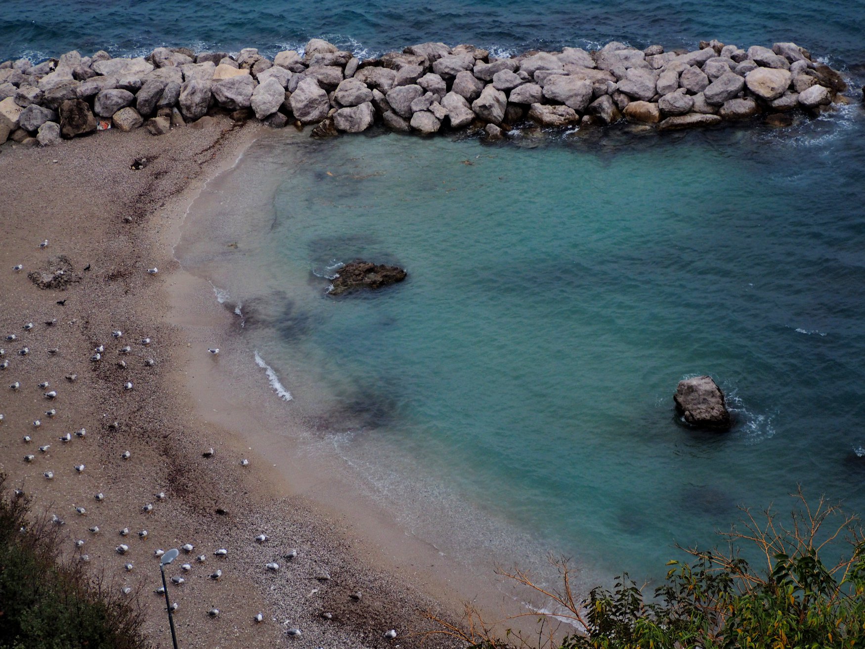 아침에 베란다에서 보이던 해안가 풍경 왼쪽의 하얀 점들은 모두 갈매기들이다