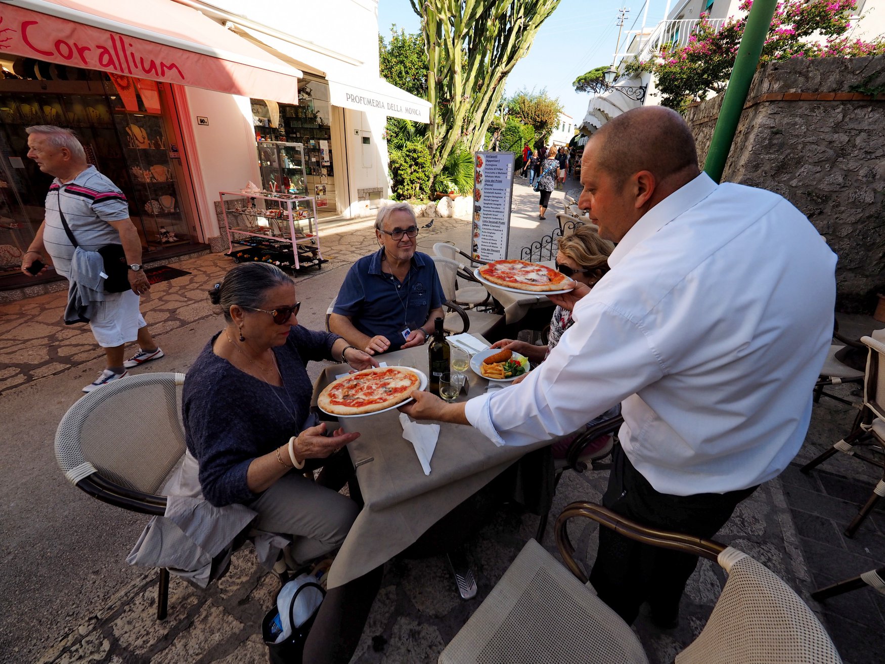 아나카프리는 세라믹 제품도 유명하다. 세라믹 아트타일로 구워 낸 장식용 큰접시, 조각품 등을 구입하면 세계 어느 곳이든 잘 포장해 배달해 준다. 골목에는 레스토랑도 많다. 나폴리가 가까워 그런지 마리나라 피자와 마르게리타 피자가 먹을만 하다. 카프리 섬 최고의 비경을 보려면 ‘세조비아 몬테 솔라로’ 빌딩으로 가야 한다. 몬테 솔라로는 1시간을 걸어 올라 가도 되지만 의자식 리프트를 타고 올라 가는 것도 매우 특별한 경험이 될 수 있다. 12분 정도 올라 가는 리프트에 앉으면 카프리 섬의 절경이 눈앞에 펼쳐진다. 1인용 의자라 무서울 듯 하지만 모두 즐거운 표정이다.