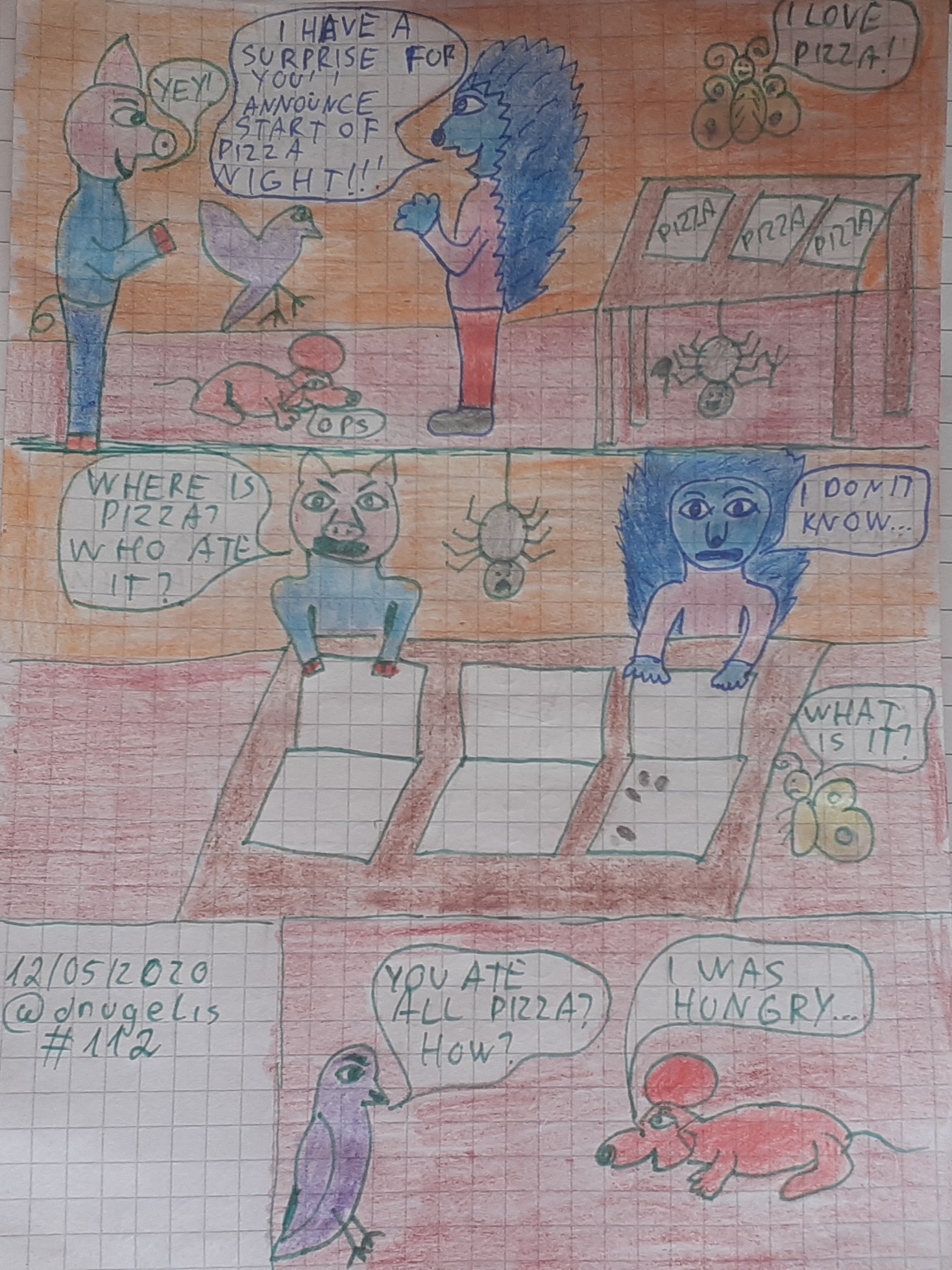 Pizza partysteemCreated with Sketch.drugelis (63)in #pinkyandspiky • 6 years ago Spiky planned to make a surprise - pizza night. But when he opened boxes of pizza they found that all boxes are empty... Dietrich ate all pizza... he was so hungry... #creativecoin #palnet #neoxian #marlians #upfundme