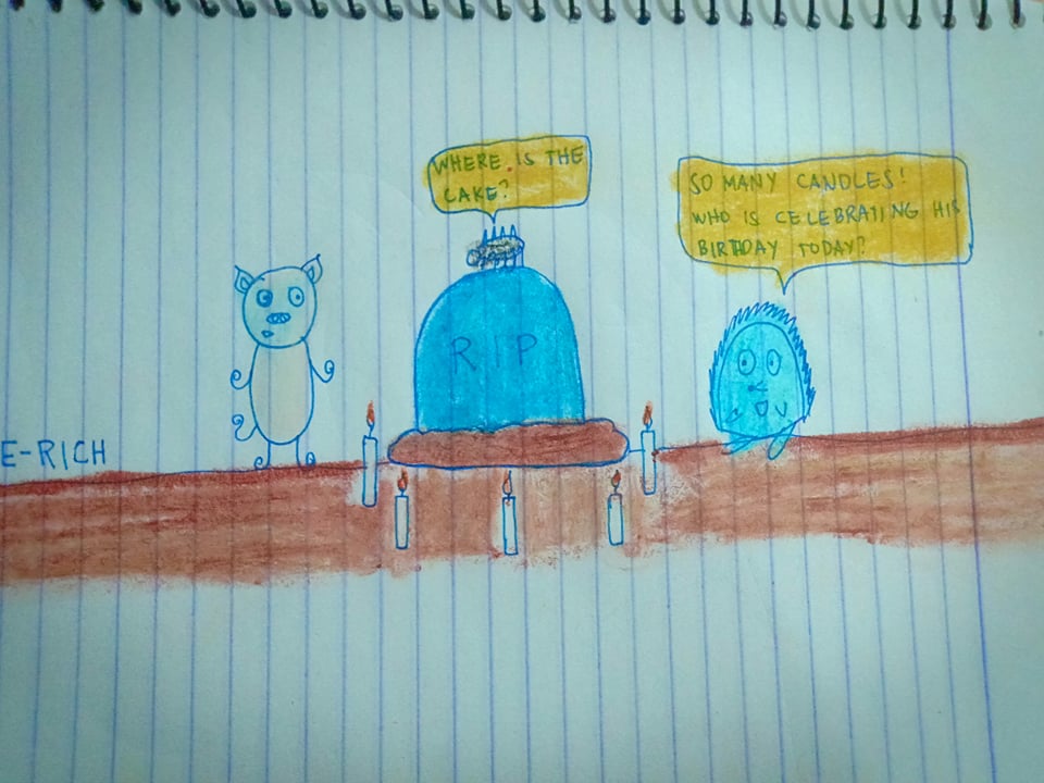 Pinky and Spiky went in the cemetery to light some candles for their dead relative. Spiky look around and wherever he looks he always see lots of different candles. He became curious and asked Pinky who is celebrating his birthday today? Victor also asked if someone has a birthday today, then where is the cake? why they only have candles.