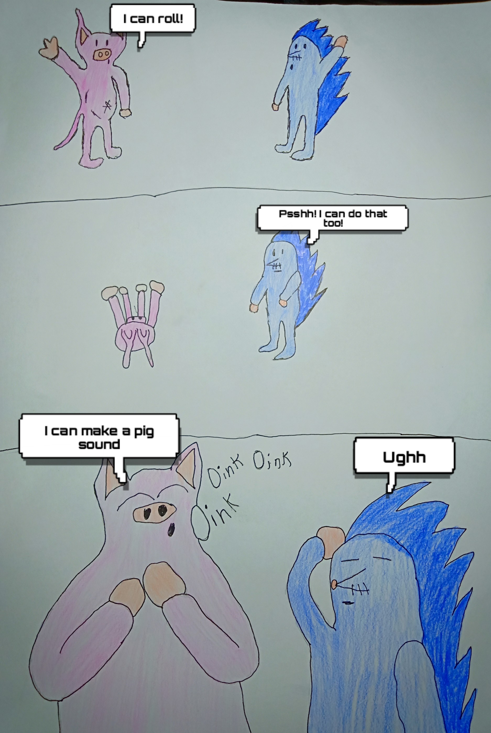 They are talking to each other and showing their abilities to find out what are their differences. Pinky said that she can roll, then Spiky replied that he can also do that easy roll. They continued showing their skills, until Pinky did a unique sound which is the Pig sound. This made Spiky silent and angry because he can't do a perfect pig sound.