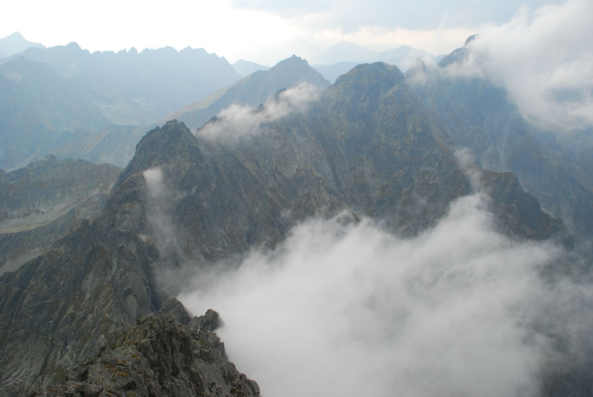 As I ascended to the Rysy summit, I encountered challenging atmospheric conditions - we were surrounded by dense fog, and the wind was relentless. Despite these challenges, the pursuit of reaching the summit filled me with a sense of determination and excitement. After a full day of hiking, I spent the night beneath Rysy in a rocky hollow on the Slovak side, enveloped by the silence and incredible atmosphere of this unique place. The morning turned out to be sunny and warm, and the views were awe-inspiring.