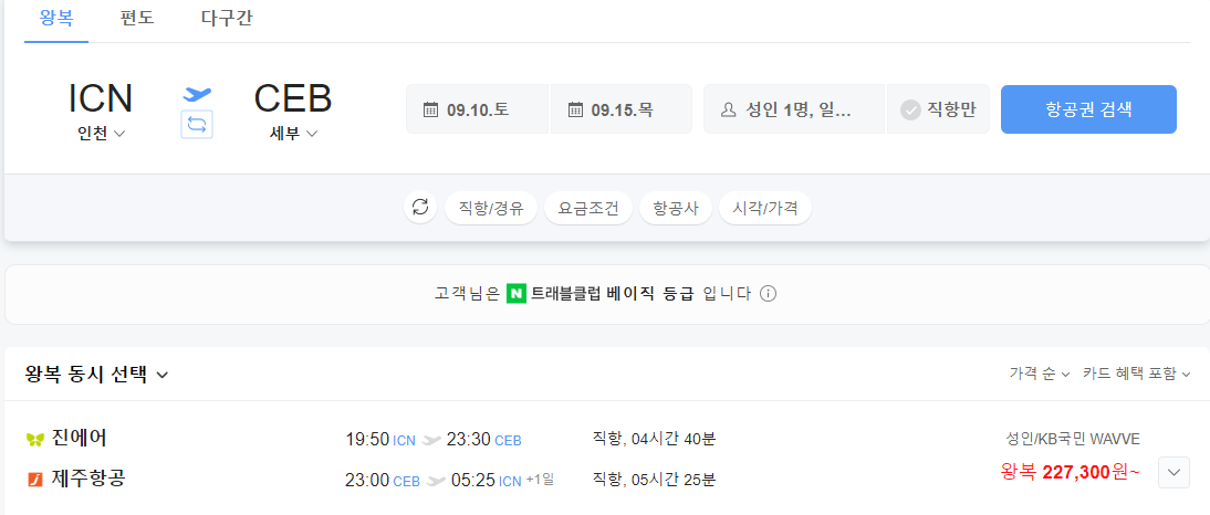 인천-세부 직항으로 4시간30분~5시간 거리이며 카드 할인혜택을 받아서 왕복 227,300원, 카드할인 없는 요금이라면 238,100원 이네요. 당장의 단거리는 이렇습니다.