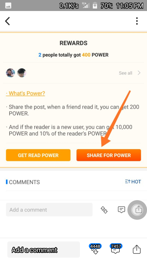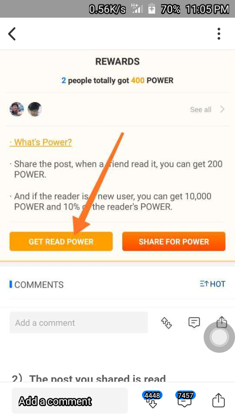 When a post which you shared is read, you will be rewarded with 200 POWER. To receive the reading reward from this reader, it has to be the 5 earlist posts that the reader reads today.