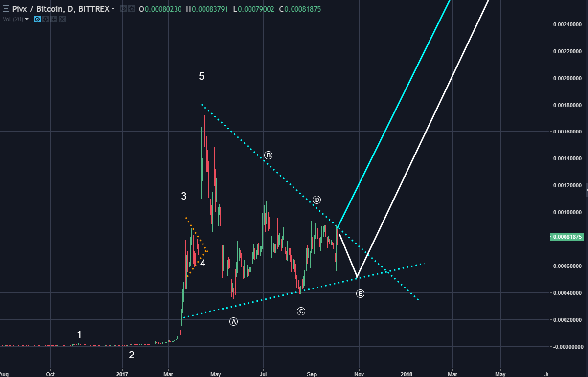 PIVX/BTC is displaying a bullish pattern. The five actionary waves (1,2,3,4,5) is now being followed by an a,b,c,d,e type of correction. Once complete, it's expected to resume the up trend. The video has much more details to consider.