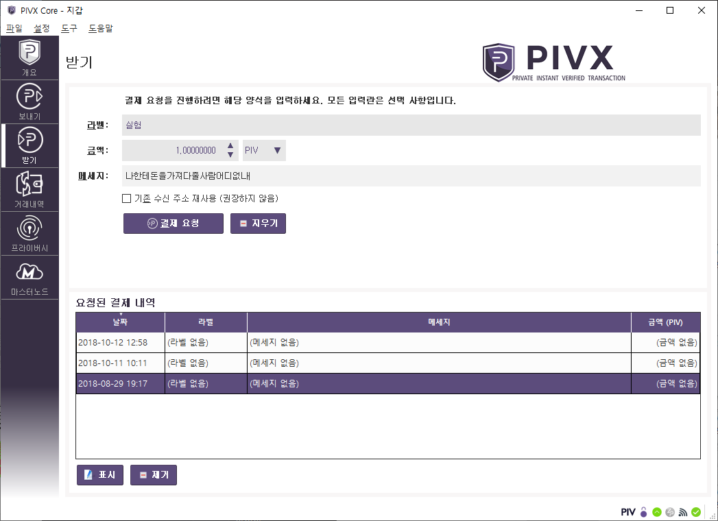 개요 보시면, 1번이 총액이고, 2번은 PIV, 3번은 zPIV(제로코인 적용된 PIVX) 4번은 최근 트랜잭션입니다.