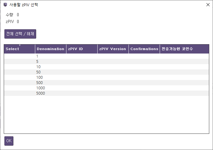 3번은 zPIV 코인컨트롤 입니다. denom 덩어리 단위로 볼 수 있어요.