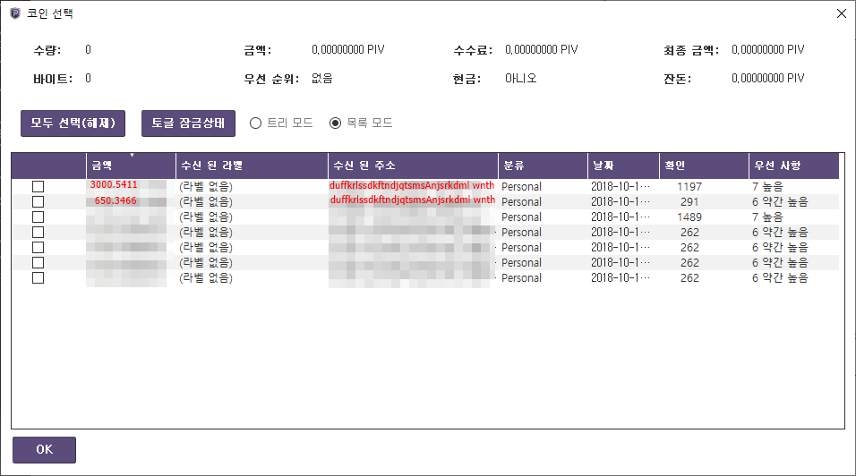 위와 같이 3650.8877 의 PIVX 가 두 덩어리로 나누어져 있음을 확인할 수 있습니다.