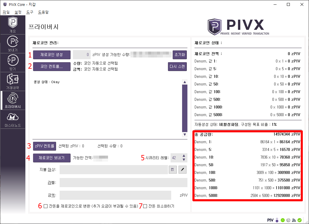 5번은 시큐리티 레벨로 숫자가 클 수록 더 안전합니다. 소액의 zPIV 을 보낼 때야 작아도 상관 없지만, 대량의 경우에는 애초부터 조금 높은 단위로만 보낼 수 있습니다. 시큐리티 레벨을 높일 수록 보낼 때 시간이 더 오래 걸립니다.