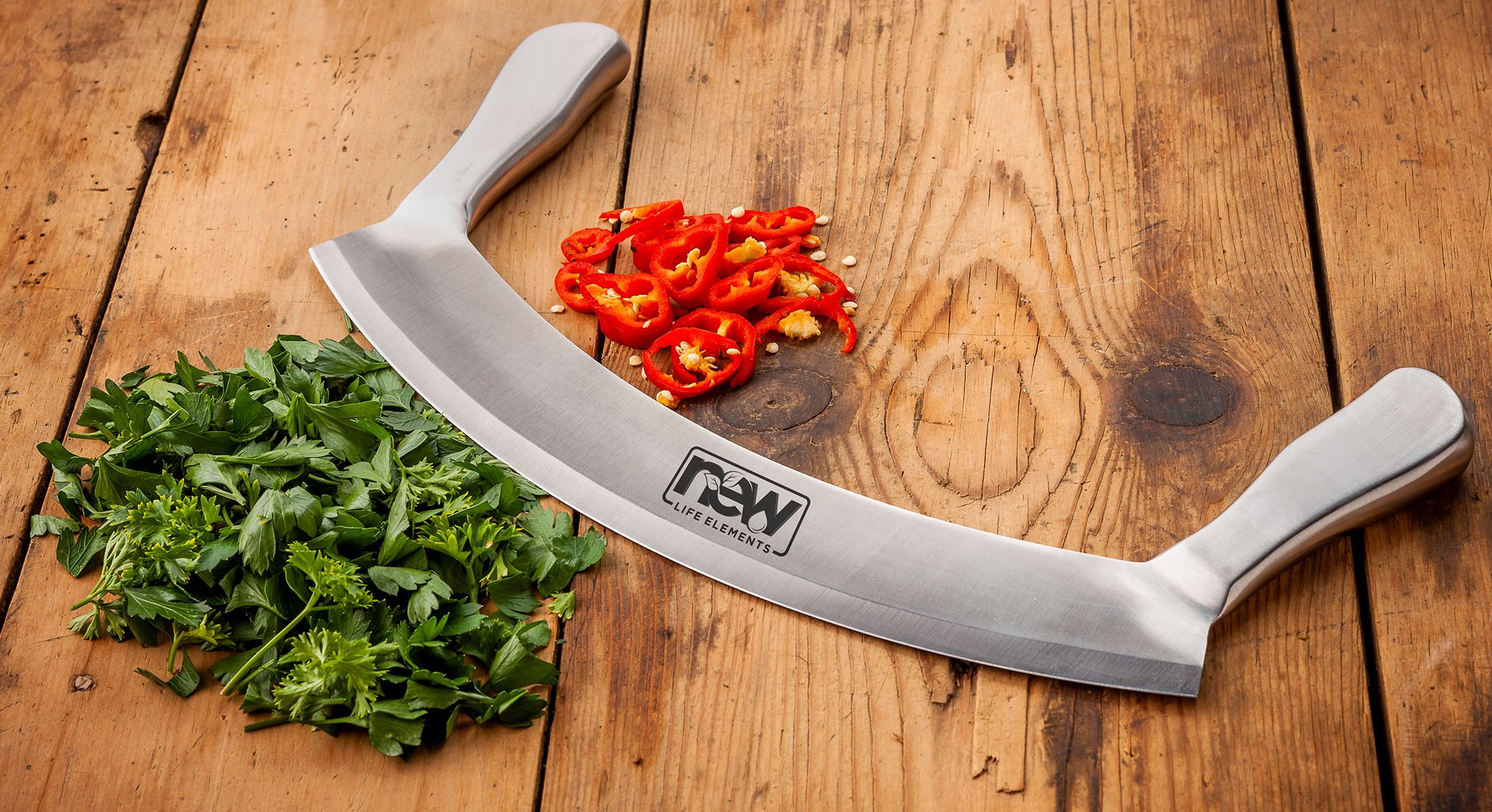 An old saying practice makes perfect it is relevant to with a New Life Elements number one Mezzaluna Herb chopper knife online. You will learn very quickly that you can make a large pile of herbs into a small pile of fresh herbs. It can be used as a Cookie Cutter as well. Awesome kitchen utility knife.