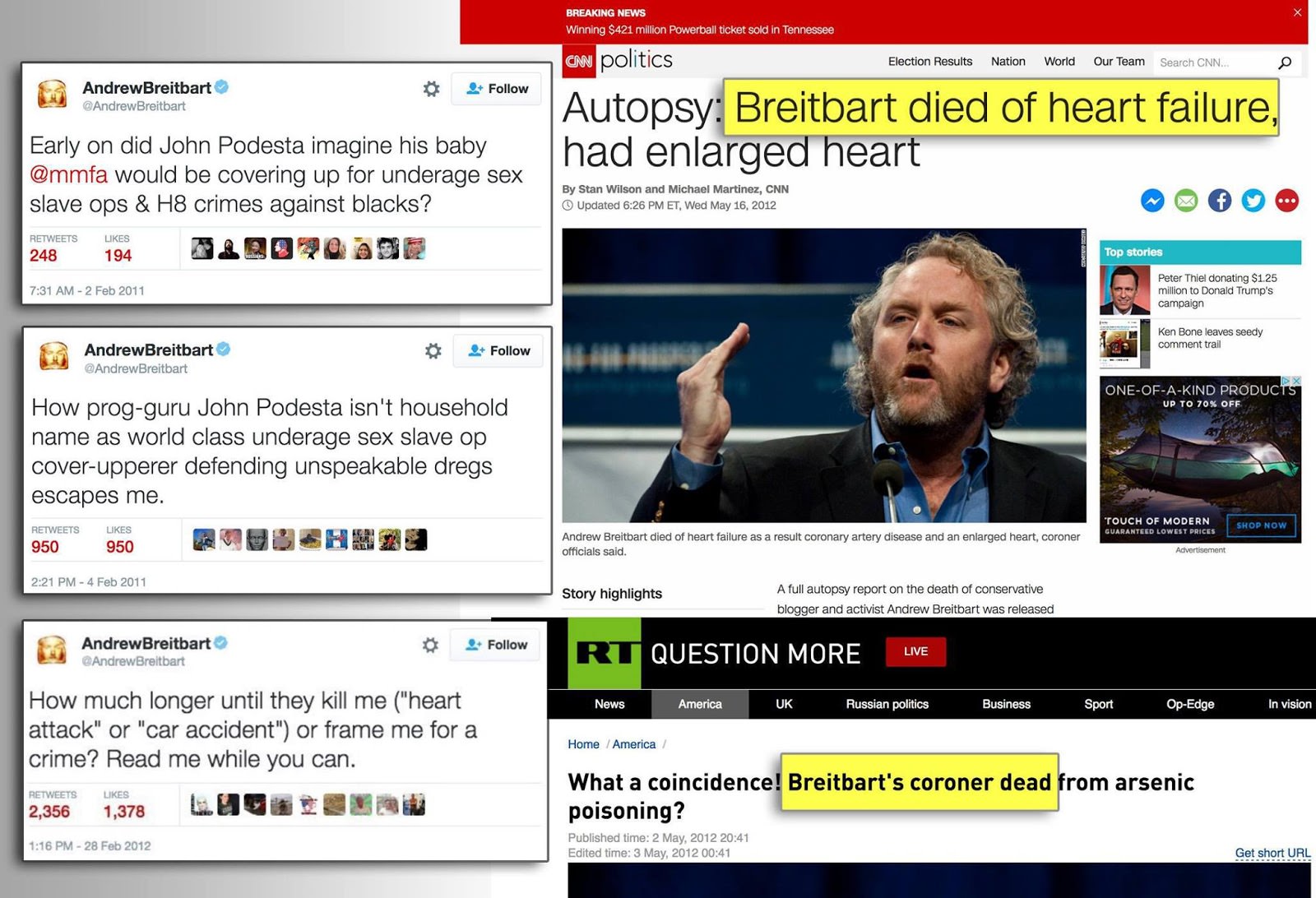 Consider the statements made by Andrew Breitbart(no hero of mine in case you are wondering) before his early death due to heart attack in which he alleges that John Podesta was involved in child abuse:
