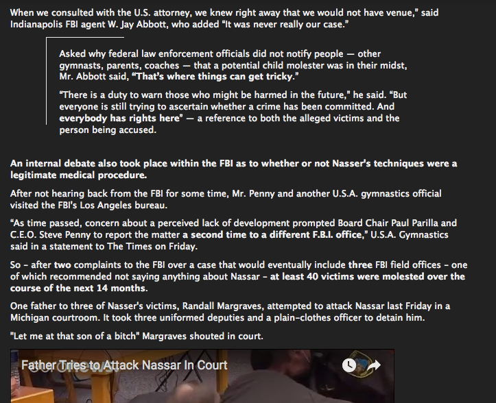Also part of the allegation is that the FBI routinely covers up certain reports of certain perpetrators. Consider the Larry Nassar case in regards to the US Gymnastic's team(also, don't pick this one, this is fact)(and please excuse the zhedge screenshot, I do not think this is a reputable source but when it embarrasses the United States zhedge can be credible, this is corroborated in many other places). This should help explain to the incredulous newcomer who might think something so naive is 'They would never get away with it!' 40 teenage gymnasts all reported their doctor touched them in ways they did not like and no one batted an eye for Years. (how many inappropriate touches would you or I get away with? zero.)