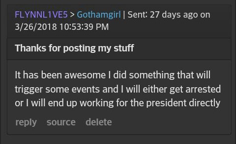 One of his last messages to user ‘Gothamgirl' says “It has been awesome I did something that will trigger some events and I will either get arrested or I will end up working for the president directly”