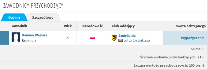 Jeśli chodzi o wzmocnienia zespołu to jak narazie jedynym oficjalnym jest przyjście w miejsce Łukasza Budziałka innego bramkarza, tym razem z Jagiellonii Białystok wypożyczono Damiana Węglarza.