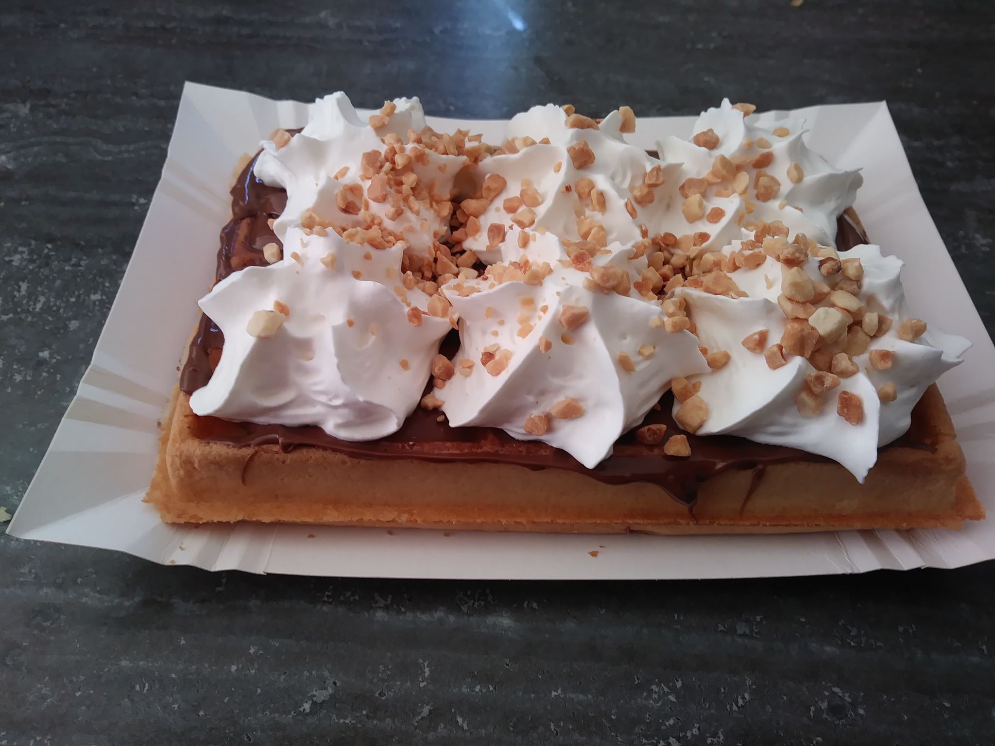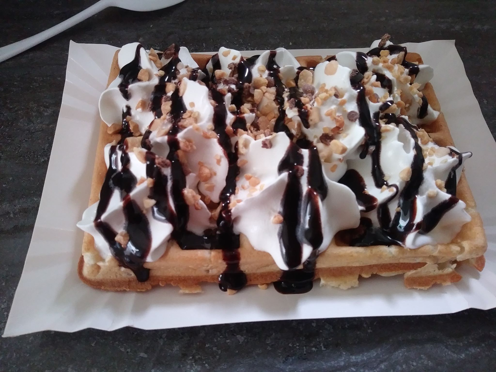 b) gofr lion z posypką lion, bitą śmietaną oraz polewą czekoladową