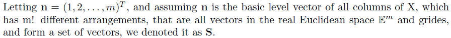 It is defined in my original manuscript (in Chinese) as follows (translated): "Let m be a positive integer, Hm={i|i=1,2,...,m} denote a set of integers from 1 until m , the subscript m represents the number of elements in the set. Any arrangement of elements of Hm is a vector of the positive integers in m-dimensional real Euclidean space Em. There are (m!) different arrangements for Hm, and they form a set, denoted as Sm.