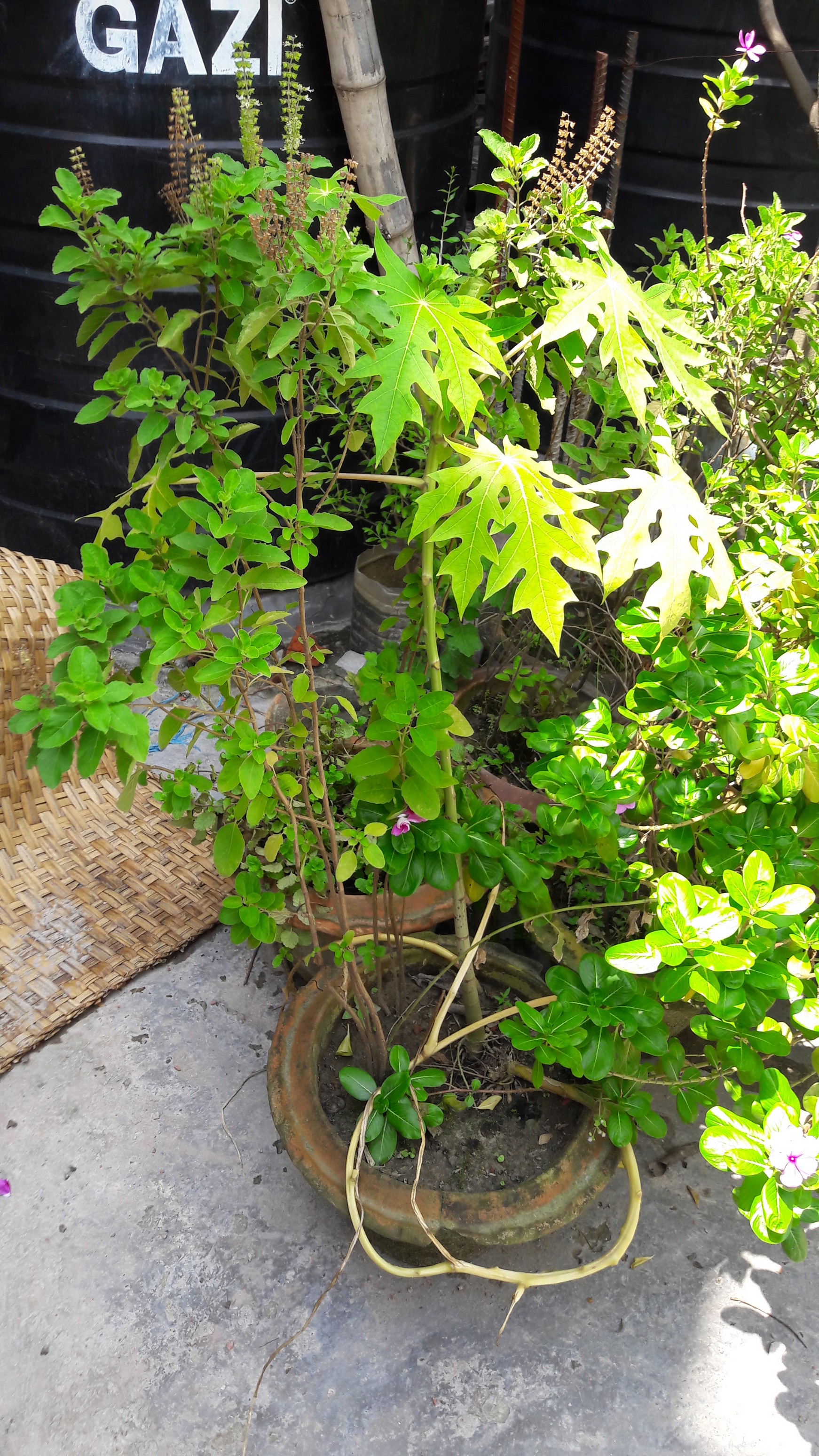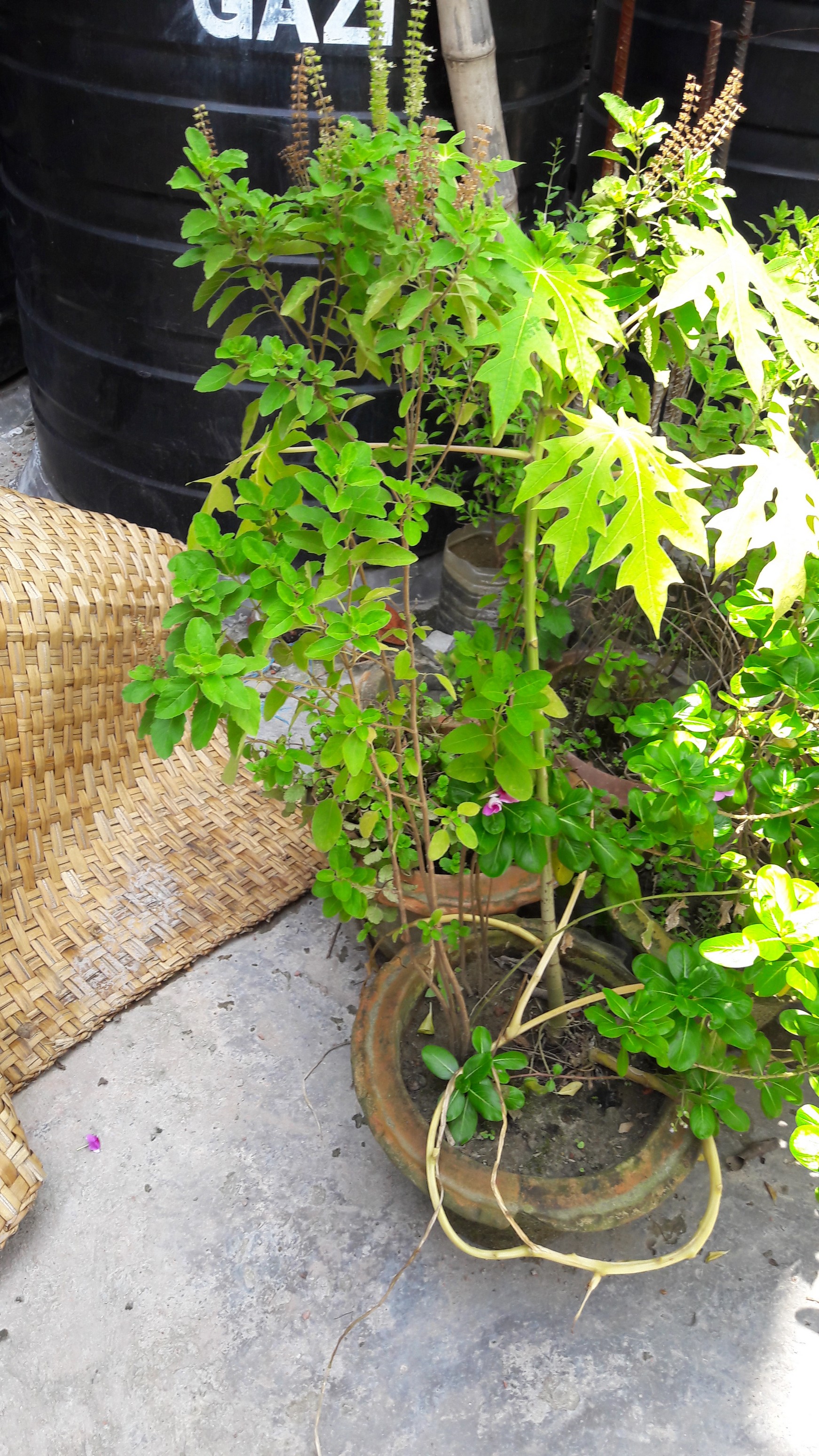Papaya, Madagascar Periwinkle, Tunsi Basil or Ocimum Tenuiflorum those three plant in a pot. So much to do thing I need to do but I in mess. Any Pot I get empty I plants other, not happy in only one Item. If you would like get more infraction about my plants you check link in the below.