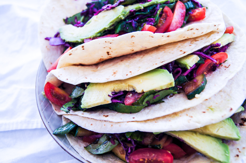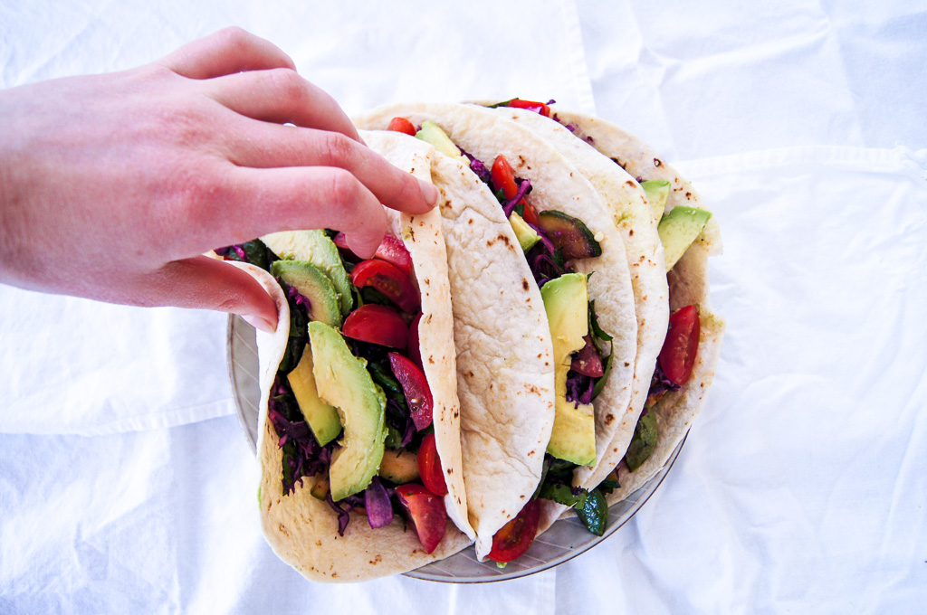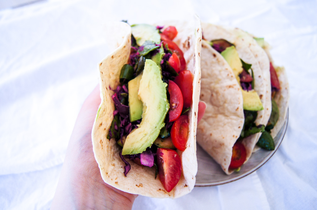 Here, I will share a recipe for a spicy veggie taco with red cabbage slaw and avocado, but stay tuned- I will give some other ideas on how to stuff your tacos at the end!