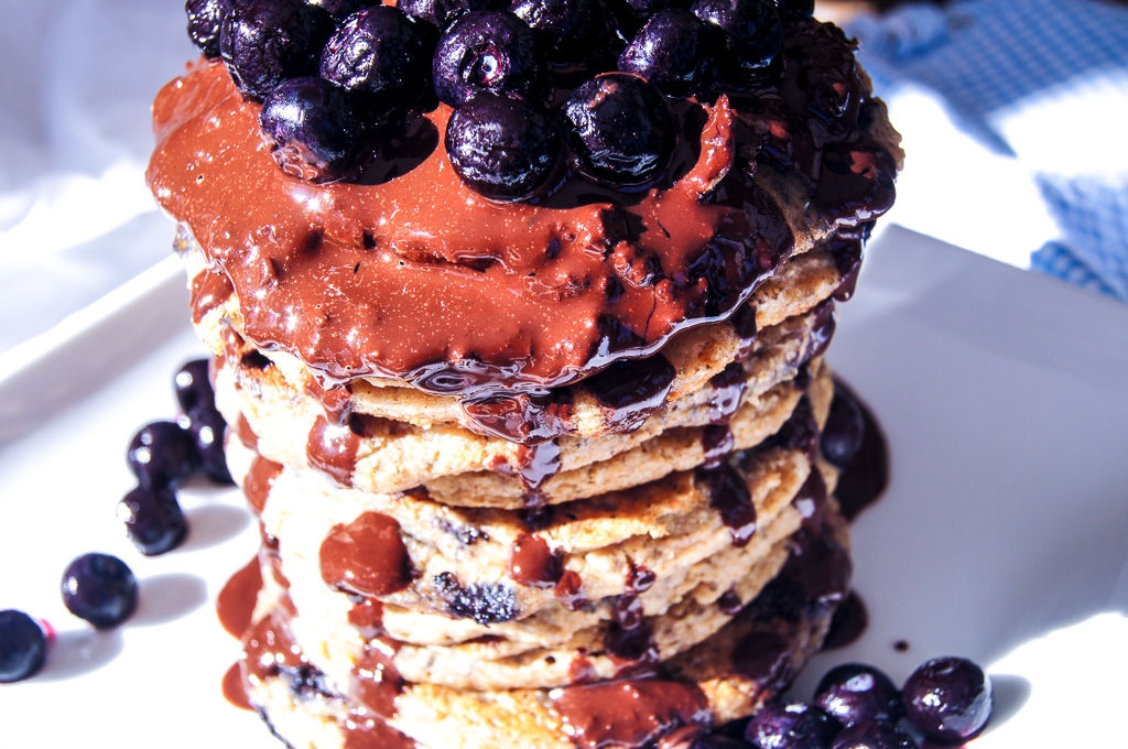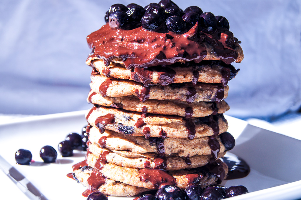 Compile your pancakes and chocolate sauce, using your remaining blueberries as topping! Enjoy!