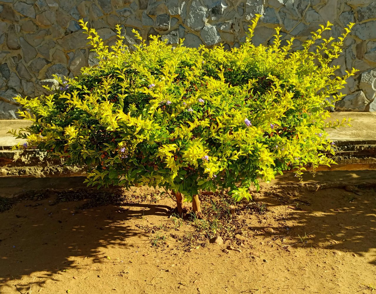 During my walk along Guirintal Beach, I spotted a shrub in the distance that caught my eye because of the way it sparkled in the sunlight; a multitude of colors could be seen: yellow, green, orange, gold, and violet, but as I got closer, my perception changed. This is a shrub scientifically known as Duranta erecta, or simply Duranta to its friends 😂. Belonging to the Verbenaceae family, it owes its name to Castore Durante, an Italian Renaissance physician, botanist, and poet.