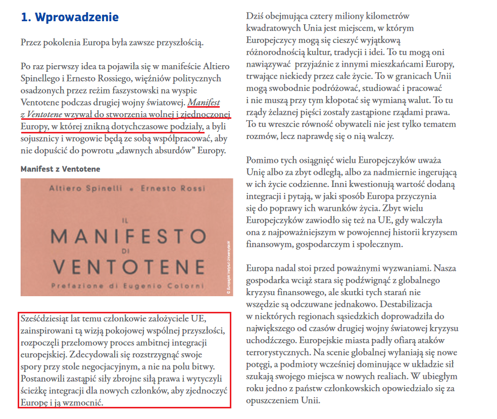 Dlaczego pamięć o faszystowskim więźniu politycznym jest tak żywa wśród współczesnych przywódców ? Altiero Spinelli nie był zwykłym komunistą, raczej turbo komunistą. Był on zwolennikiem ponadnarodowej intergracji. Zwyczajna komuna ograniczała się tylko do pojedyńczego państwa, Spinelli był jednak o krok dalej. Oskarżenie o podważanie bolszewizmu (czyli komuny) i wspieranie trockizmu (międzynarodowa komuna) spowodowało jego wydalenie z parti, ciekawe co nie ? Spinelli za życia zdążył być jeszcze europarlamentarzystą oraz członkiem komisji europejskiej. Co tak naprawdę łączy naszego bohatera z UE ? Biała księga w sprawie przyszłości Europy. "Czyli 5 różnych wizji zmian w UE i ułożenia współpracy w gronie 27 państw bez Wielkiej Brytani" Jest to pierwszy oficjalny dokument powołujący się na "Manifest z Ventotene" a raczej komunistyczny manifest z ventotene... Poniżej umieszczam fragment białej księgi.