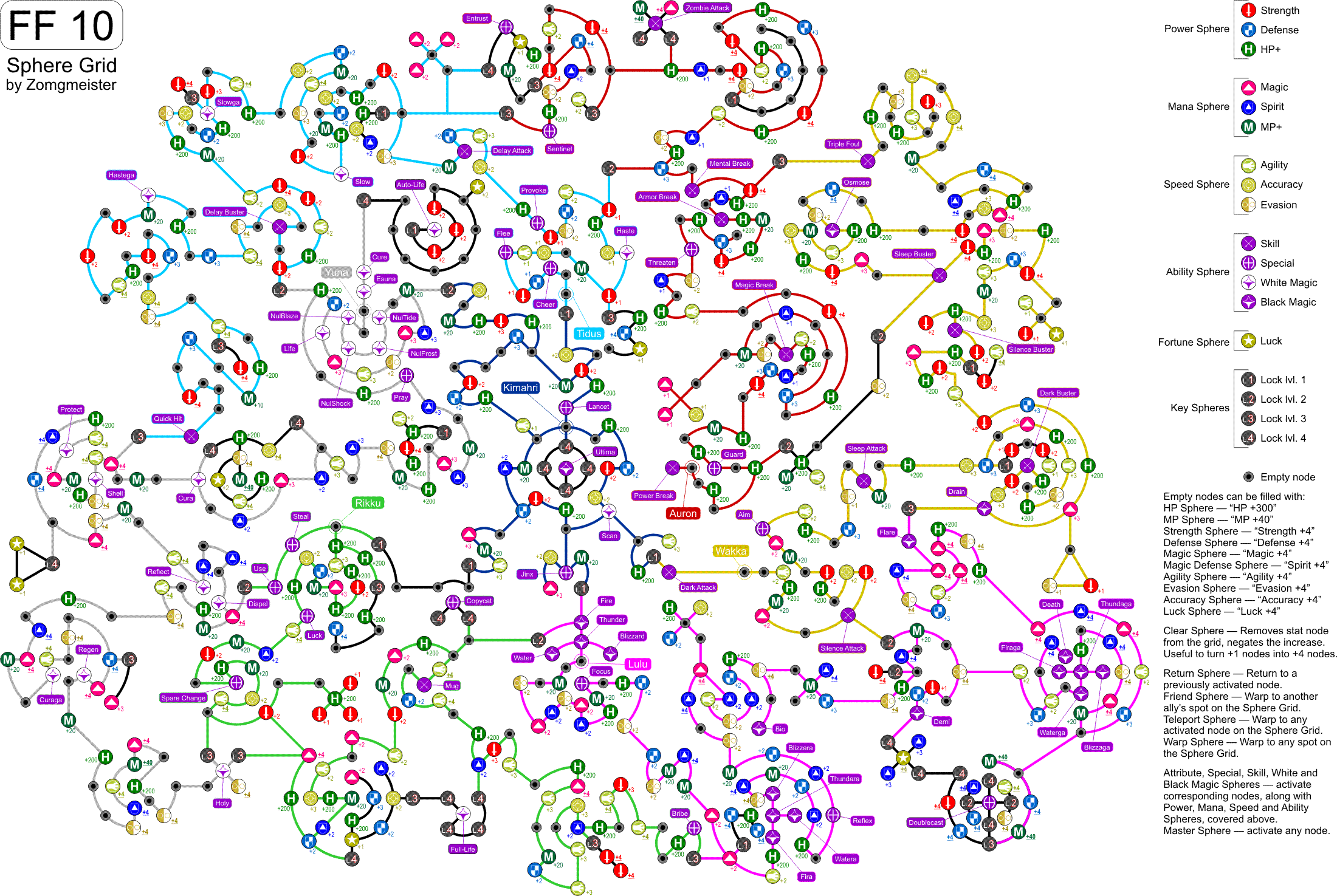 Każda postać ma własną specjalność. Tidus jest szybki i nadaje się do bicia zwykłych mobków. Lulu jest magiem, więc skupia się na magicznych istotach. Yuna jest supportem, leczy, a do tego przyzywa co jakiś czas potężne stwory (Aeony), które sieją spustoszenie i są bardzo dobrą opcją na Bossów. Waka jest pod Agility, więc zajmuje się latajacymi mobkami. Kamahri potrafi kraść skille przeciwników i się ich uczyć, a Auron ma silną łape, więc skupia się na wielkich przeciwnikach i tych z dużym współczynnikiem armora. Rikku natomiast jest złodziejem.