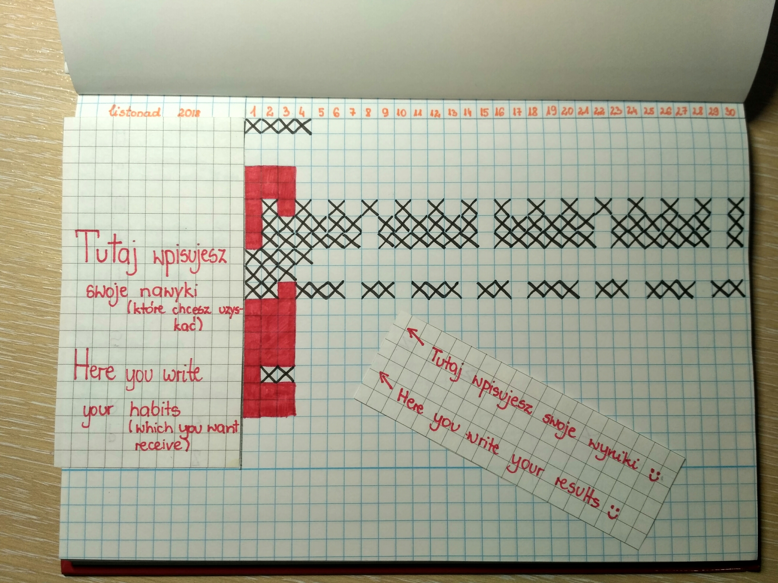 Czerwone kwadraciki to oznaczenia że w danym dniu udało ci się wykonać twój nawyk, trzeba tu pamiętać, że jedna linijka to 1 nawyk. Dzięki temu, będzie ci łatwiej zapisywać.