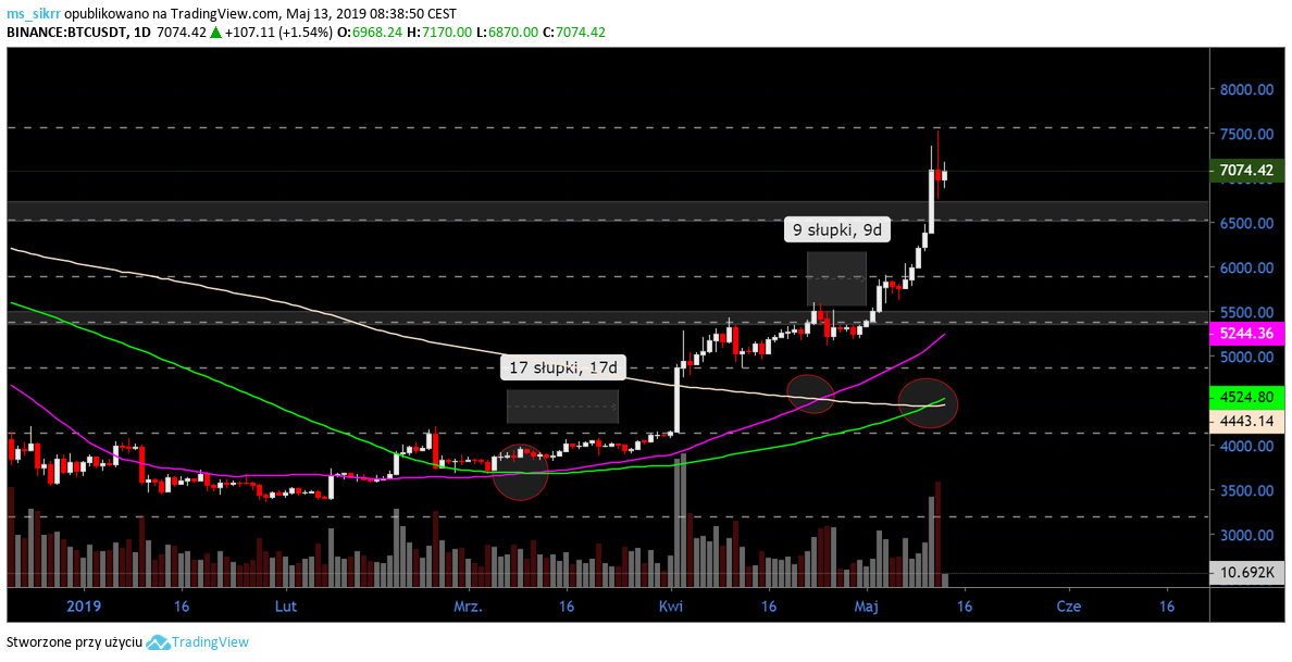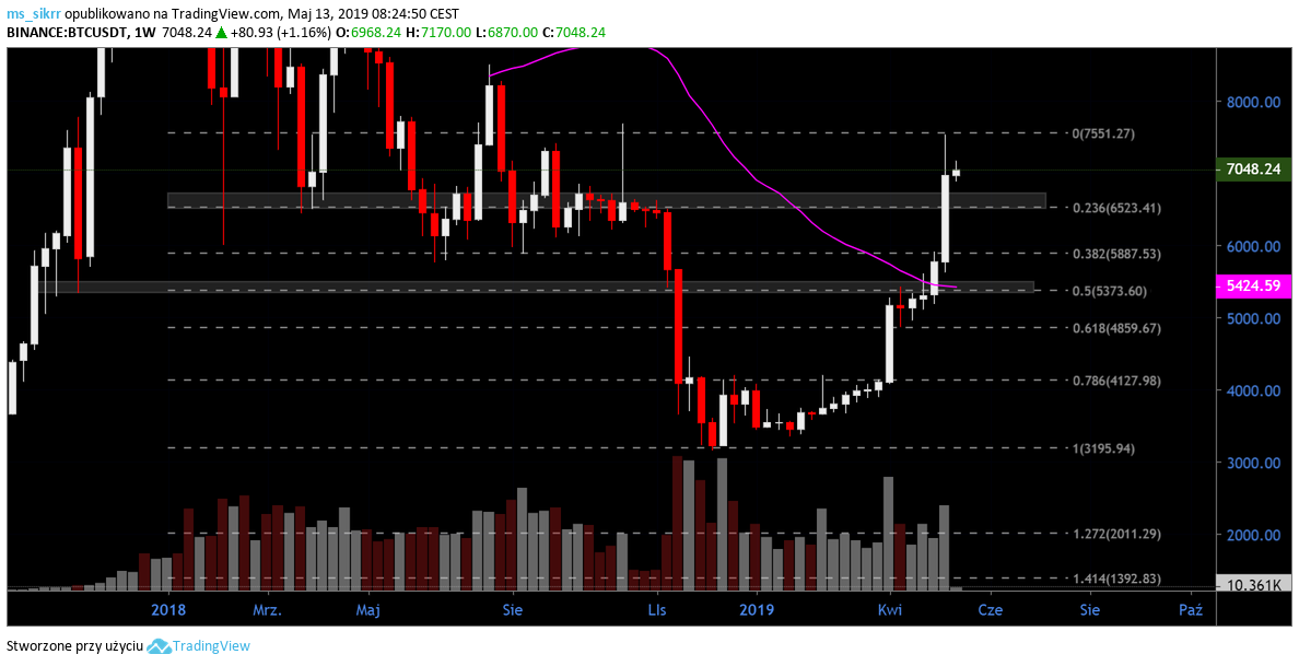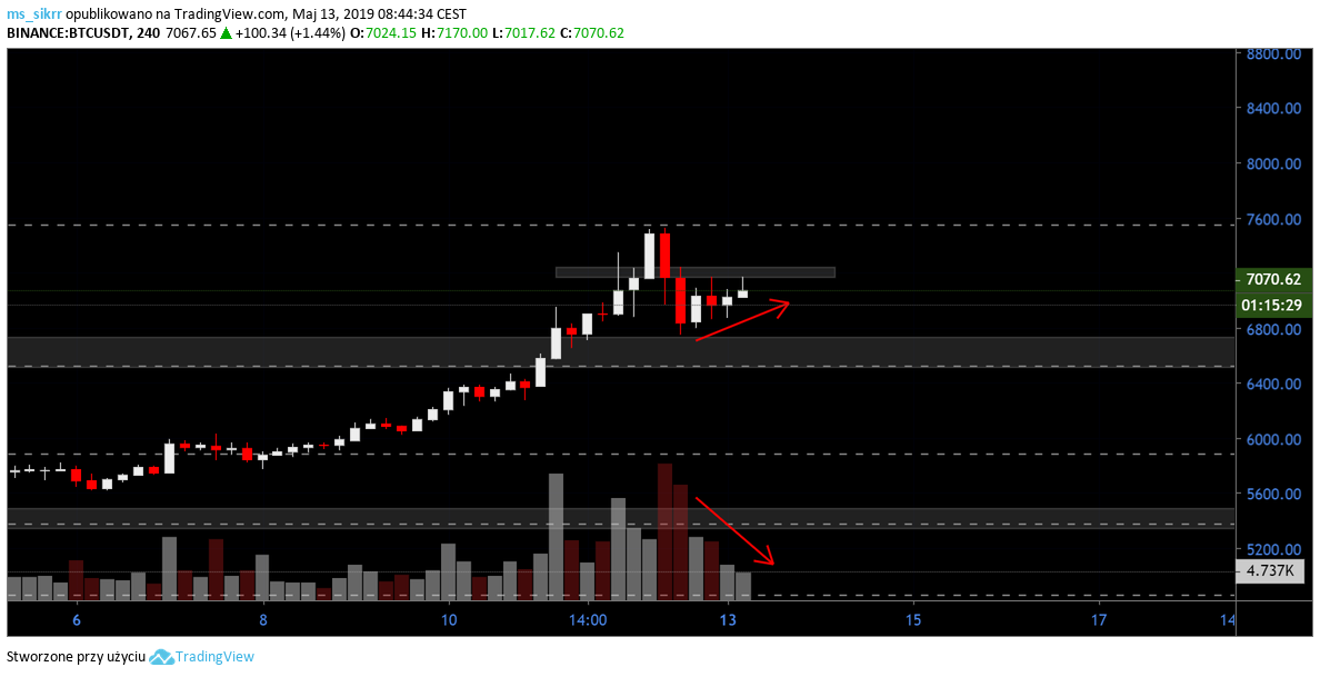 Warto też spojrzeć na całą sytuację z innej strony: gdyby nie ostatni dziwny "inside hack" na binance i afera z tetherem, to byłbym bardzo bullish i nastawiony na dalsze wzrosty, natomiast w mojej ocenie przepchniecie ceny przez strefe oporu 6000-6800 było sztuczne. Binance odegrało tu ważną rolę blokując wypłaty i wpłaty środków. Według ostatnich informacji jutro zostanie przywrócone pełne funkcjonowanie giełdy i spodziewam się kontynuacji korekty oraz mozliwe jest odżycie na rynku altów.