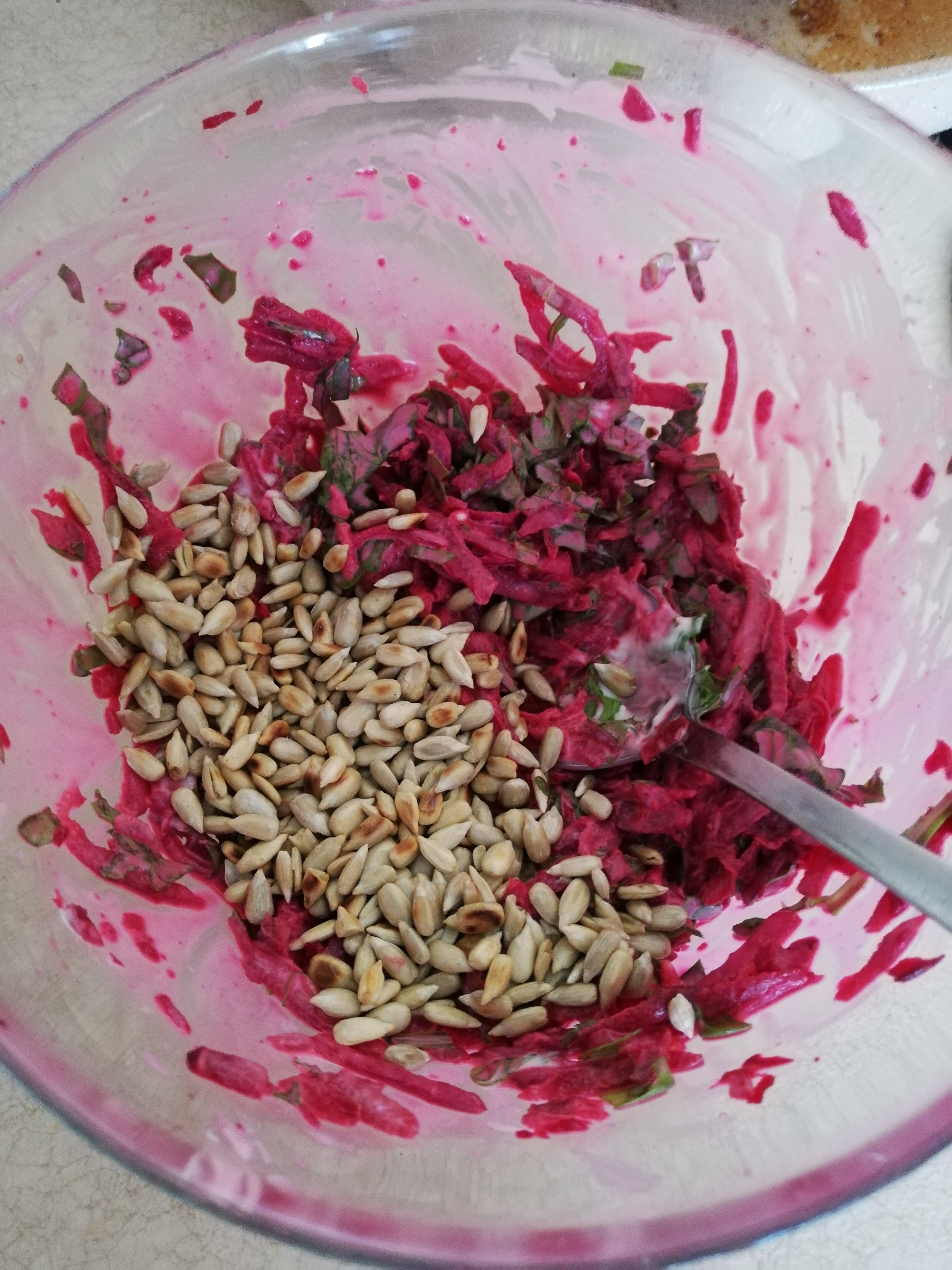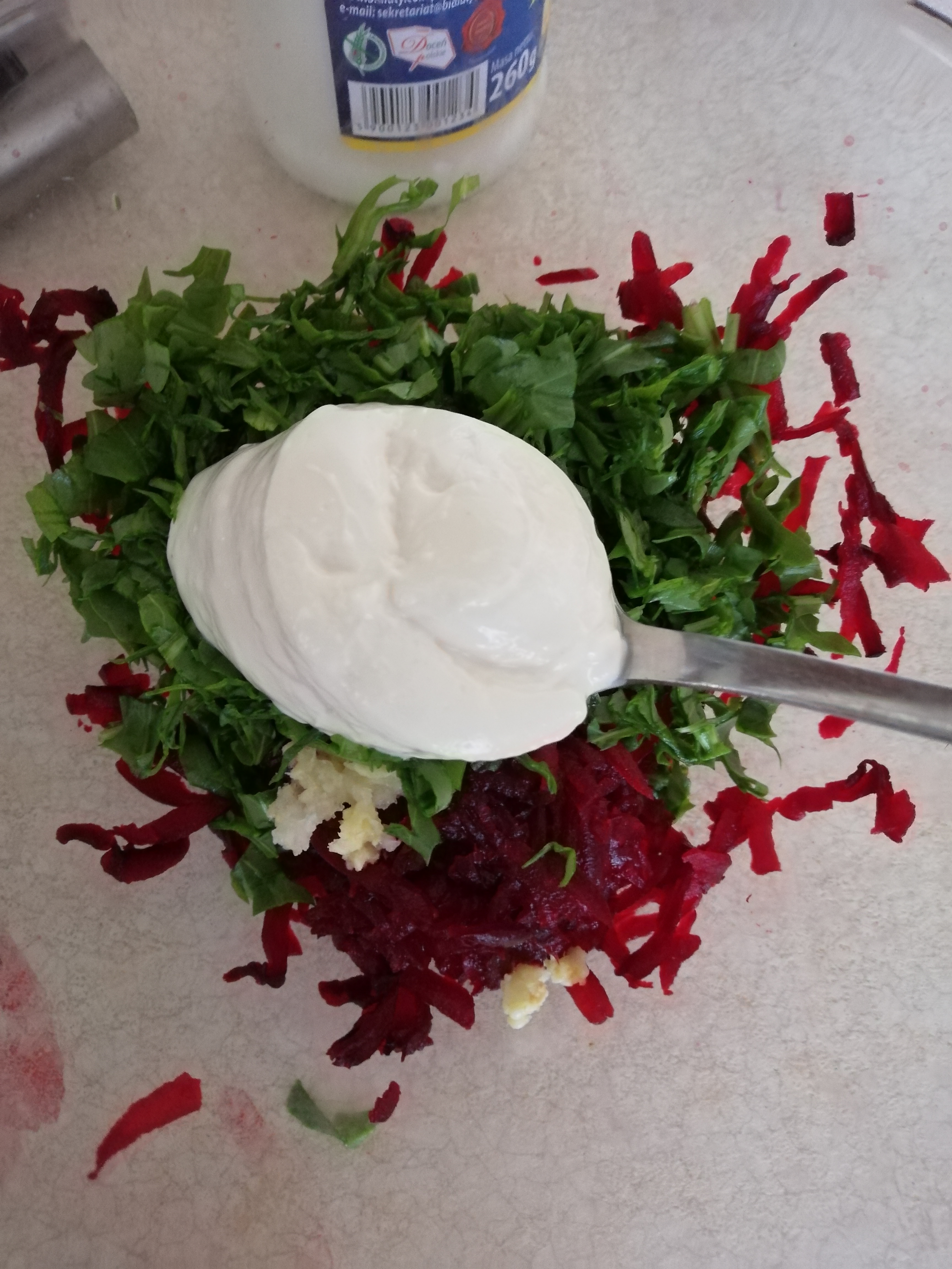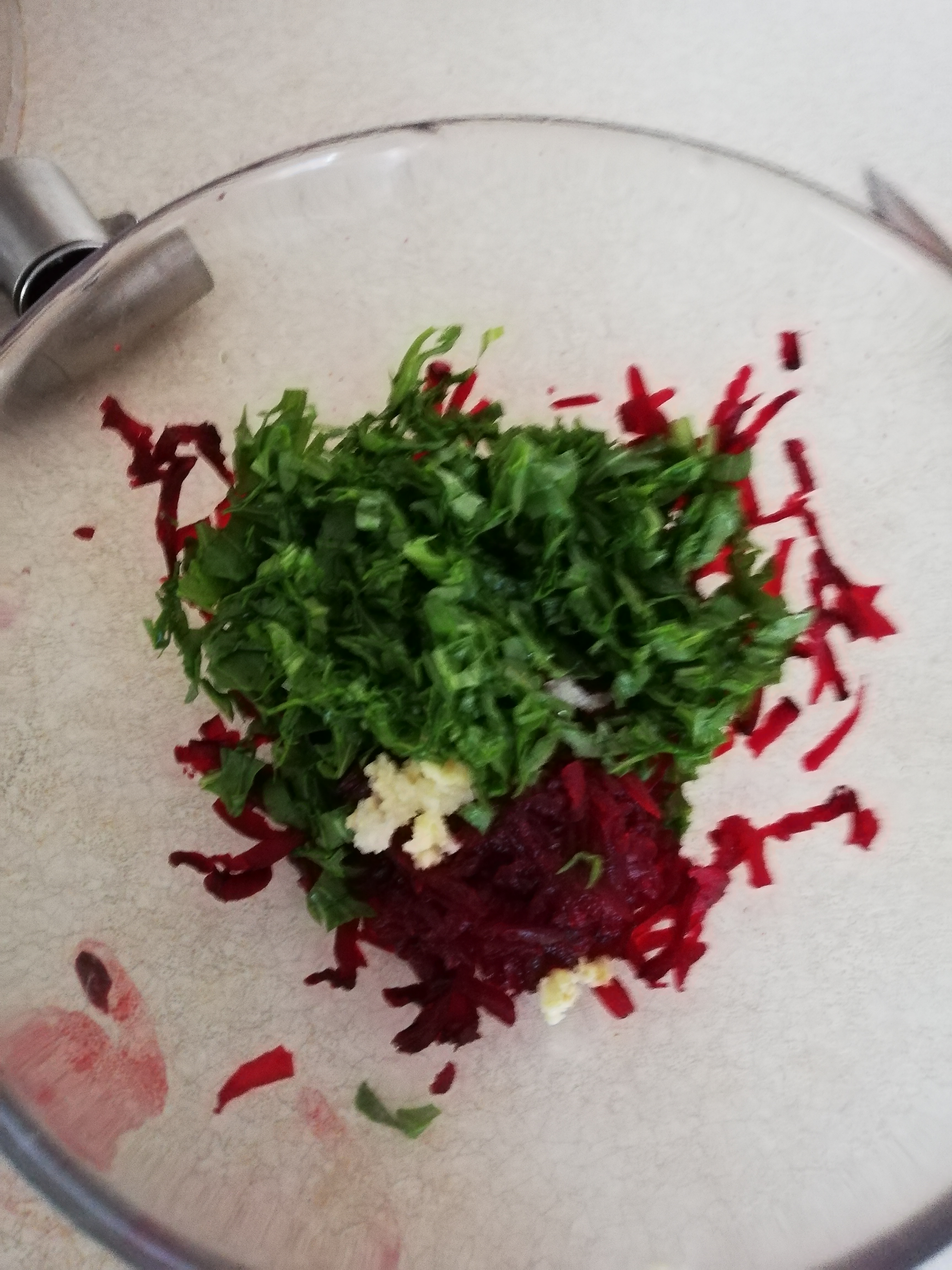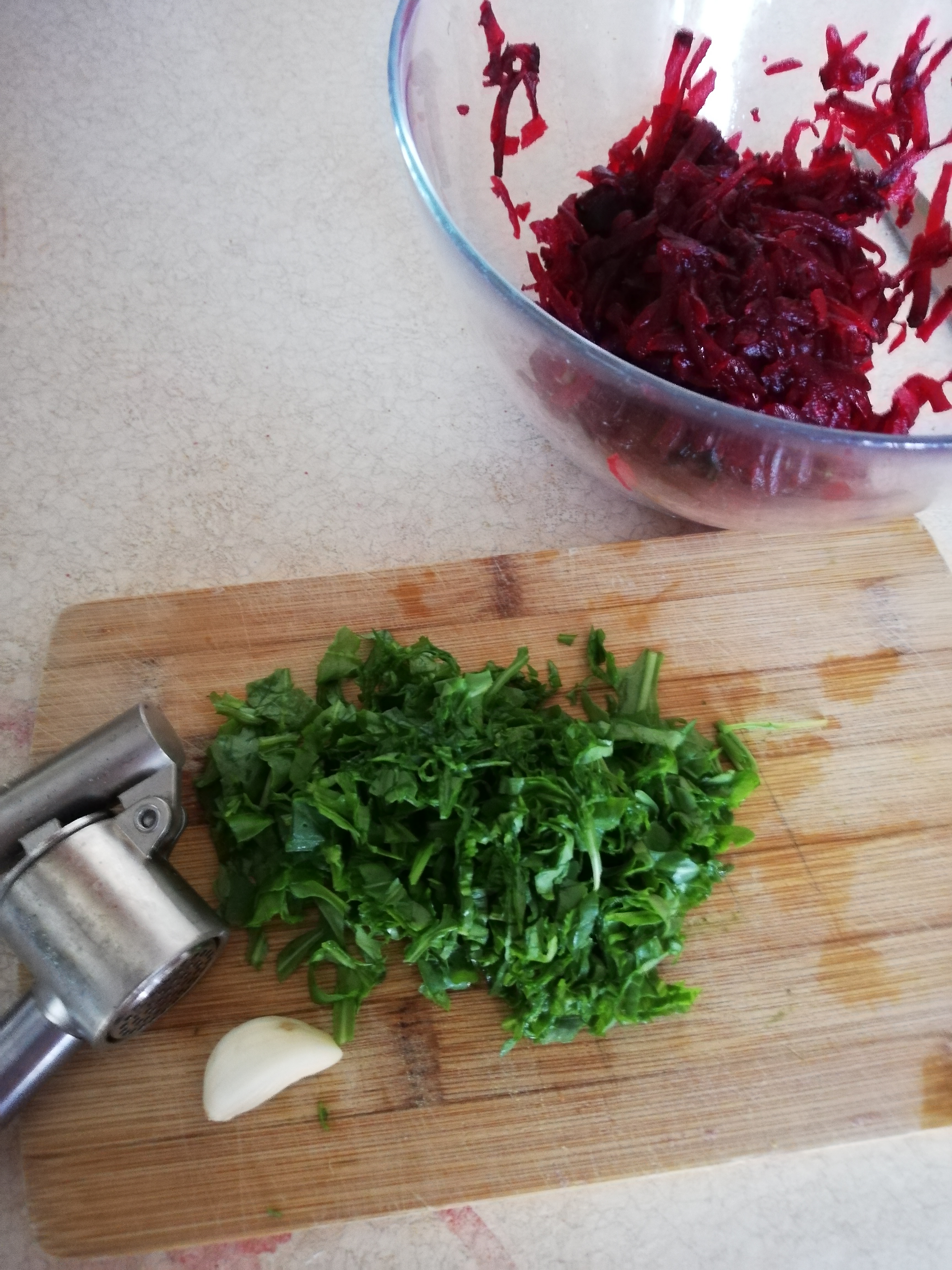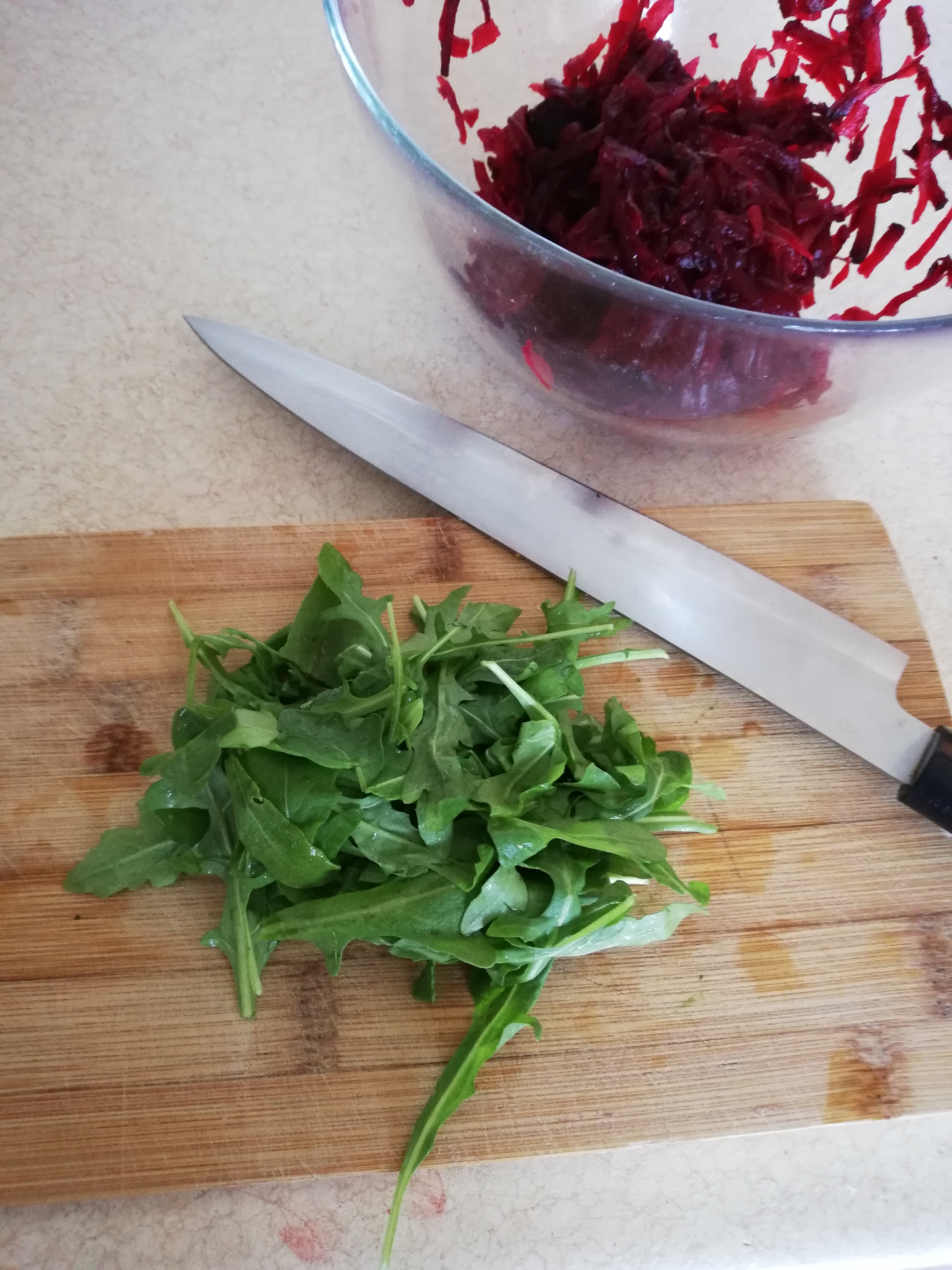 Posiekałem rukolę i dodałem sprasowanyczosnek i szczyptę soli