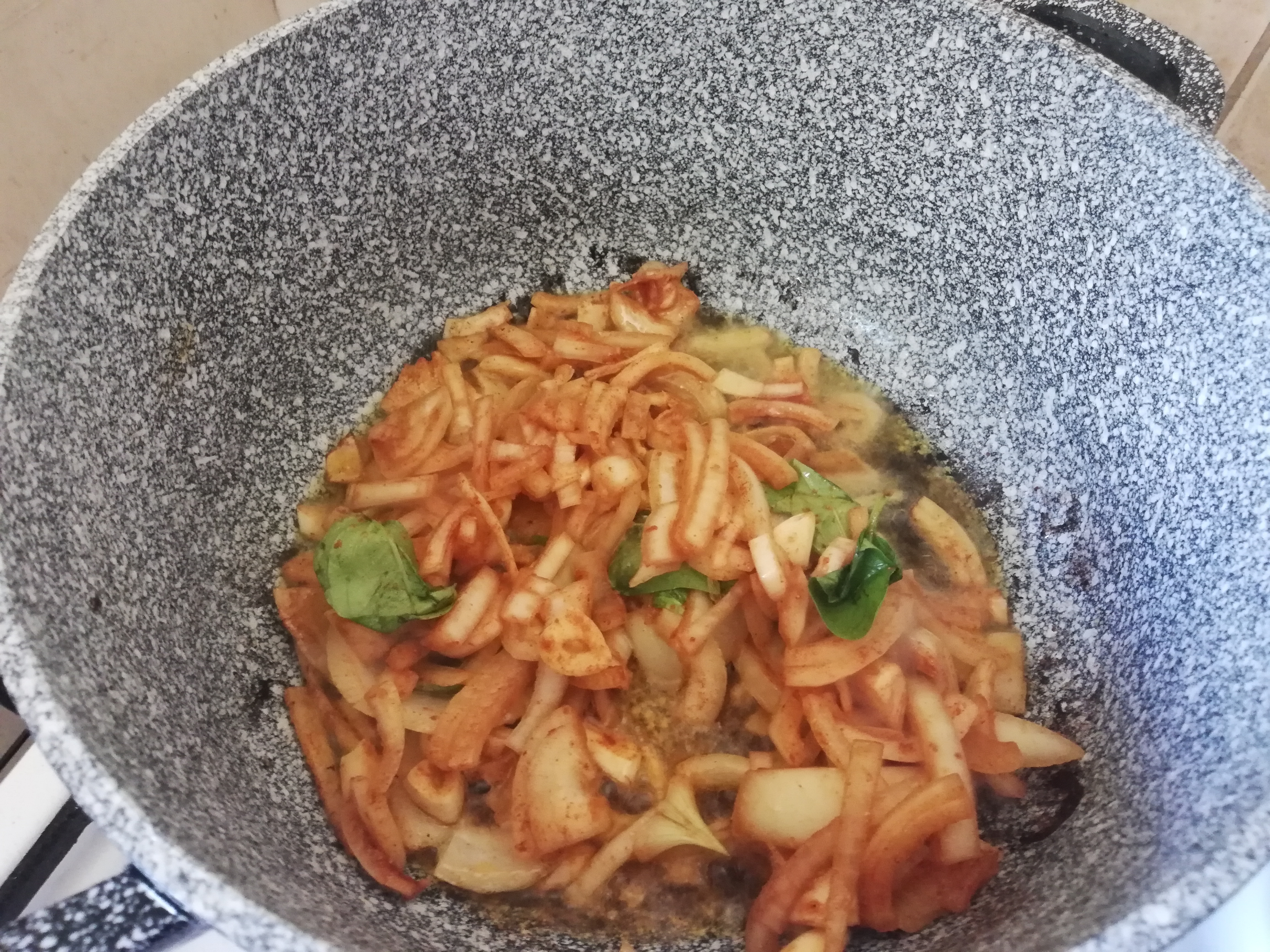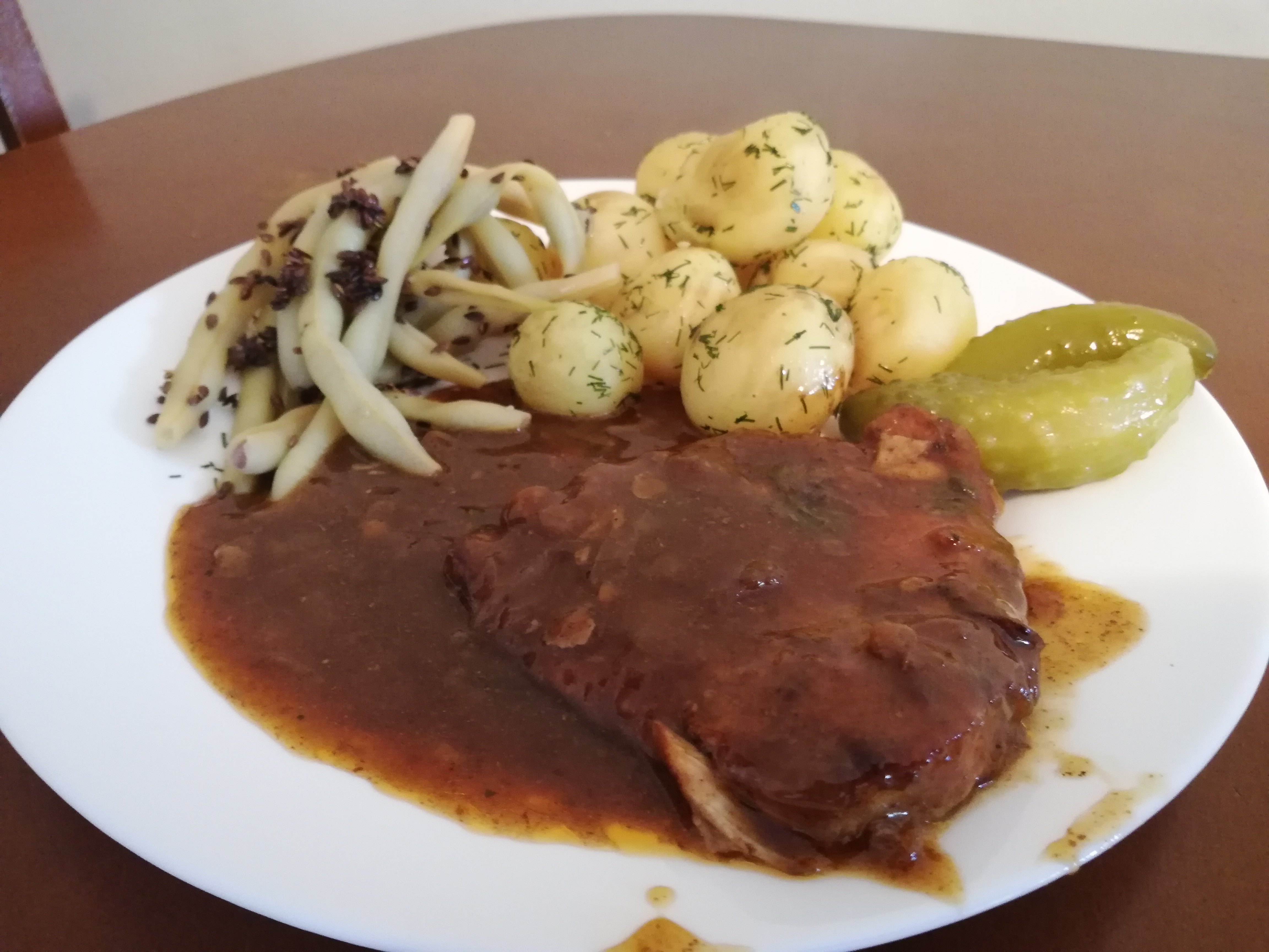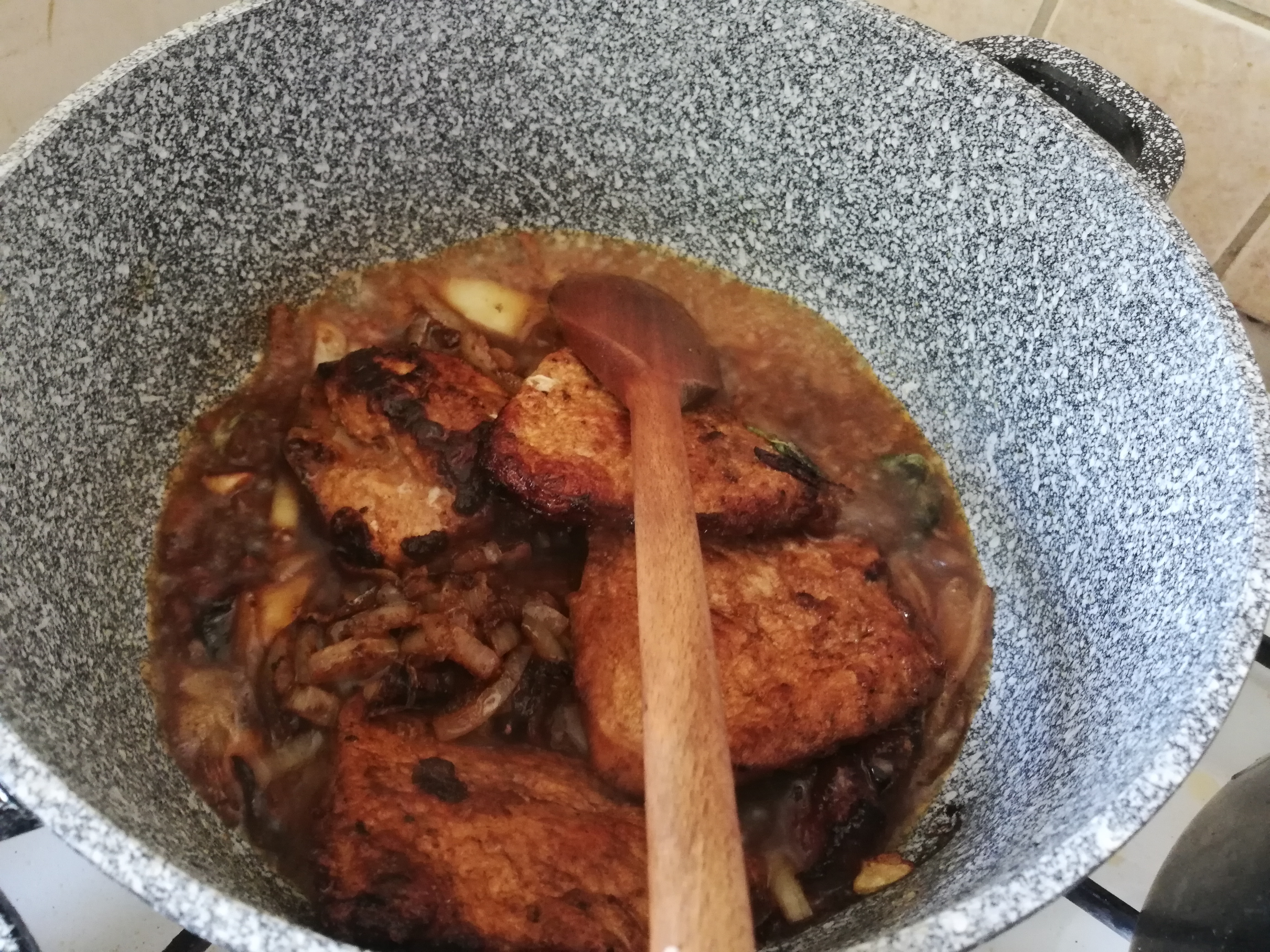Smażyć na smalcu samo mięso potem zdjąć. Podsmażyć cebulkę ta co było marynowane mięso. Dodać usmażone kawałki mięsa i lekko podlewać woda. Gotować pod przykrywką ok 1 h. Doprawić sos jeszcze do smaku. Później zagęszczam odrobina mąki. Nie znam innego sposobu może ktoś ma jakiś fajny pomysł. ☺️