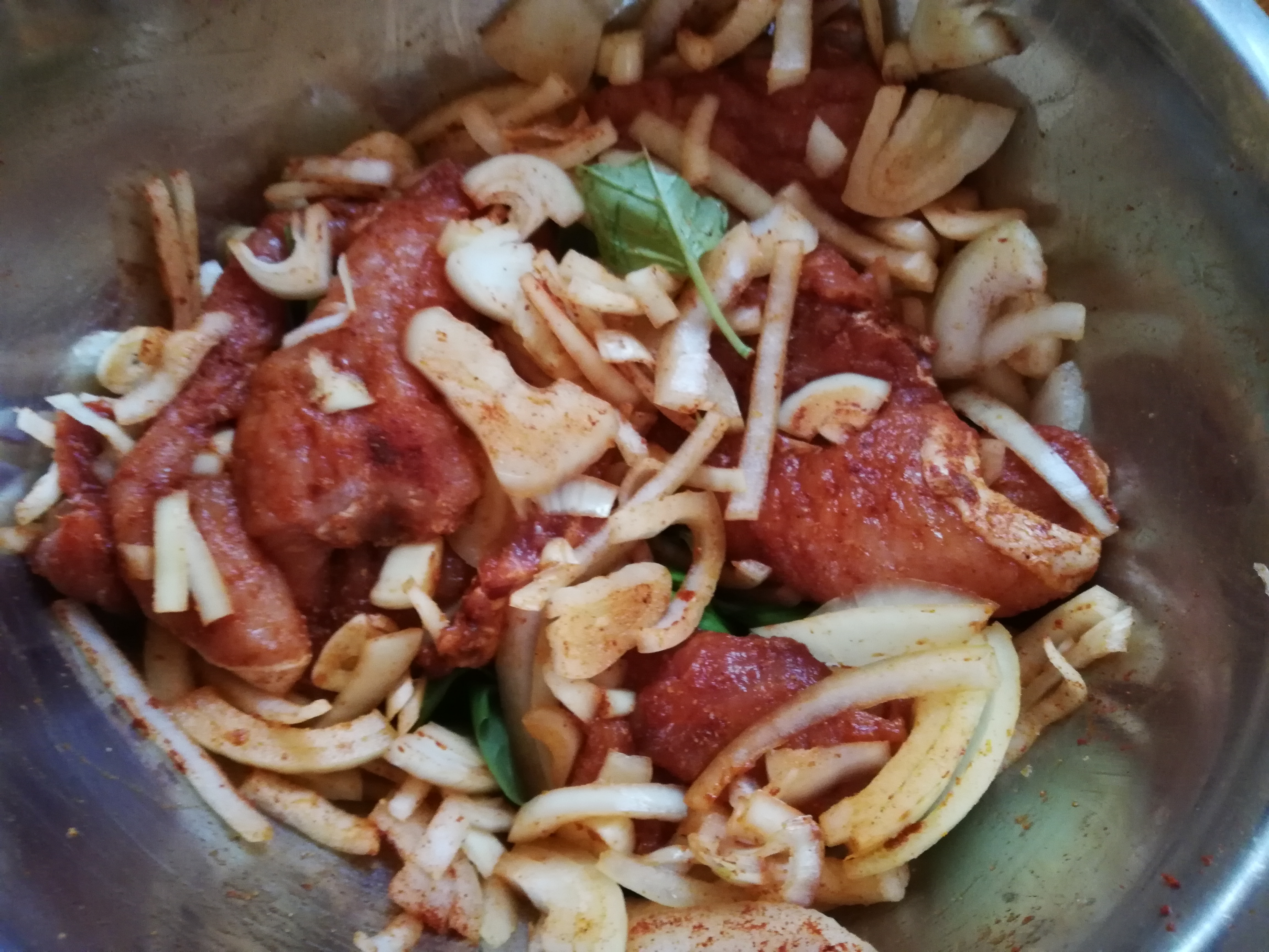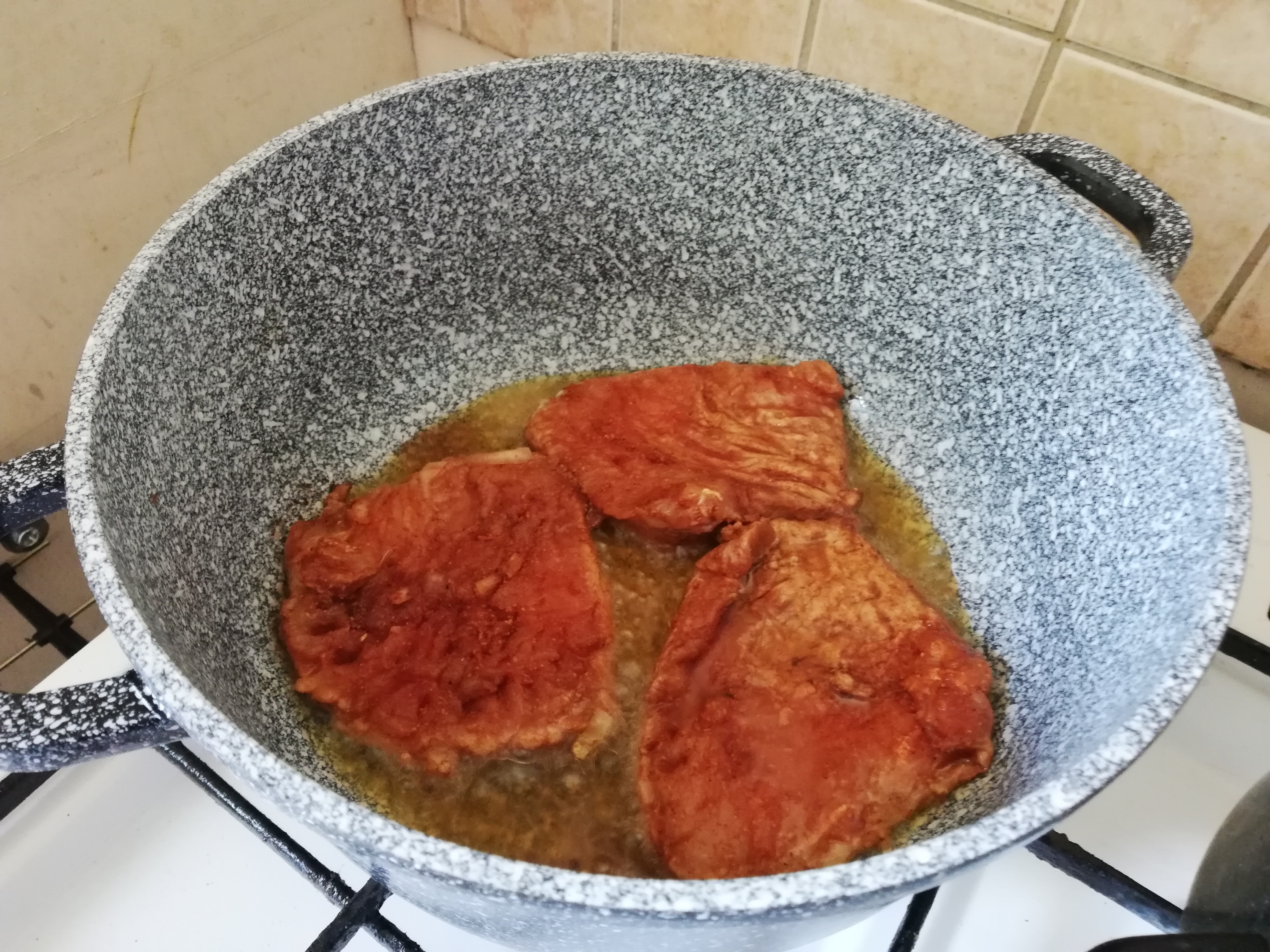 Mięso pokroić w plastry trochę rozbić, zamarynować najlepiej dzień wcześniej z pokrojoną cebulką czosnkiem bazylia i przyprawami.