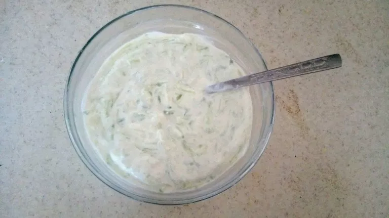 Ogórka obierz i zetrzyj na tarce, odcedź wodę z ogórka. Potem obierz i posiekaj czosnek. Następnie do jogurtu dodaj przyprawy, ogórka i czosnek. Wszystko dokładnie wymieszaj.