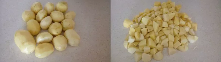 Ziemniaki obierz i pokrój w kostkę. Następnie włóż je do garnka, zalej wodą i posól. Ziemniaki gotuj do momentu, aż staną się miękkie około 20 min. Potem zlej ziemniaki.