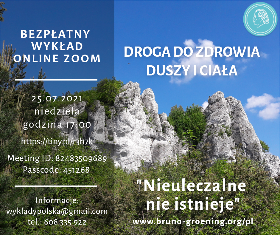 Zapraszamy szukających pomocy i wszystkich zainteresowanych na bezpłatny wykład informacyjny „Droga do zdrowia ciała i duszy”, za pośrednictwem internetowej platformy Zoom. W trakcie wykładu dowiedzą się Państwo, jak samodzielnie i bezpłatnie przyjmować, dla siebie i innych uzdrawiającą, naturalną siłę dostępną dla każdego, zawsze i wszędzie.