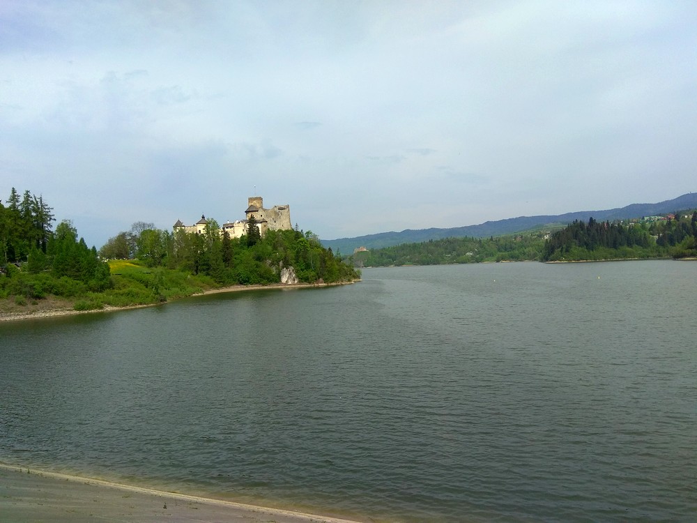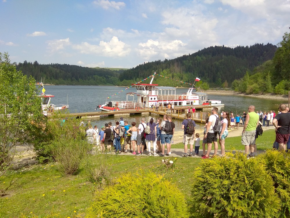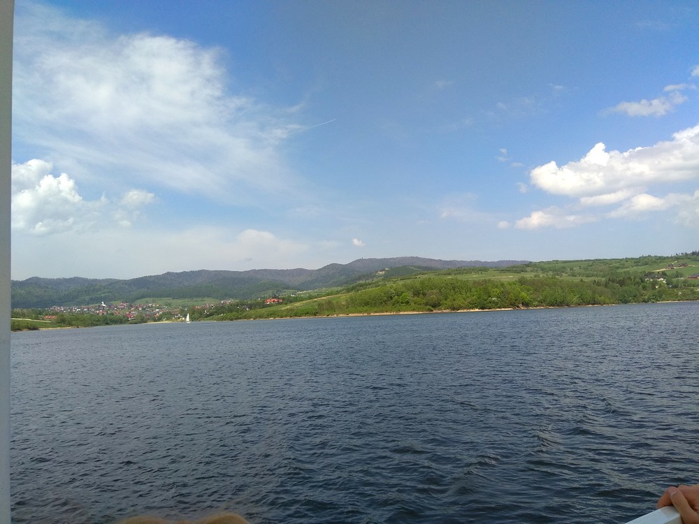 Po zwiedzaniu zamku (trwa to jakieś 2 godziny), wybraliśmy się w rejs statkiem po Jeziorze Czorsztyńskim. Jest to zbiornik wodny o powierzchni 11 kilometrów kwadratowych. Trzeba było poczekać około godziny na powrót statku i wypłynęliśmy w rejs, by zobaczyć okolicę z powierzchni jeziora. Ma ono około 9 kilometrów długości i około 1,5 kilometra szerokości, jest więc długie i dosyć wąskie. Głębokość jeziora przy zaporze to około 50 metrów. Jak widać na zdjęciach, okolica jest piękna i z pokładu statku możemy podziwiać wspaniałe widoki.